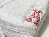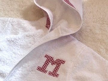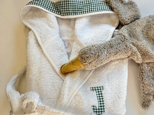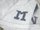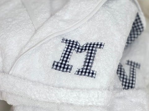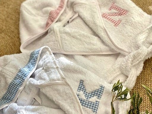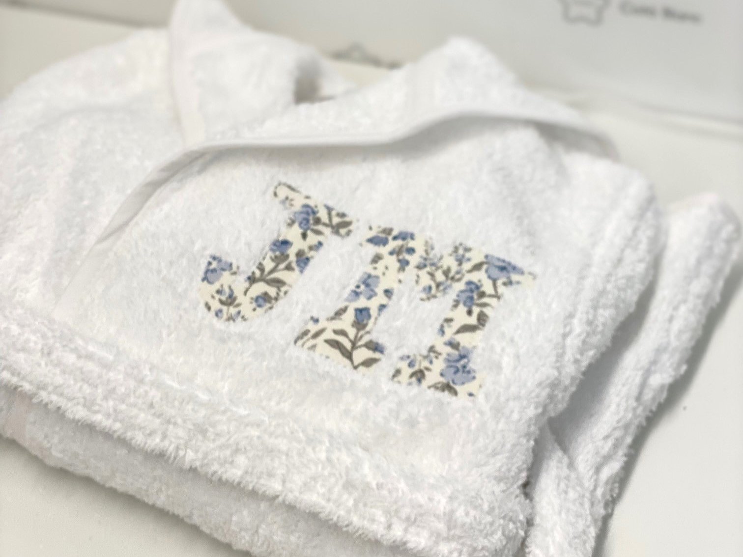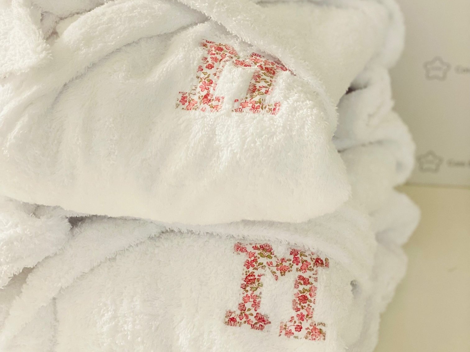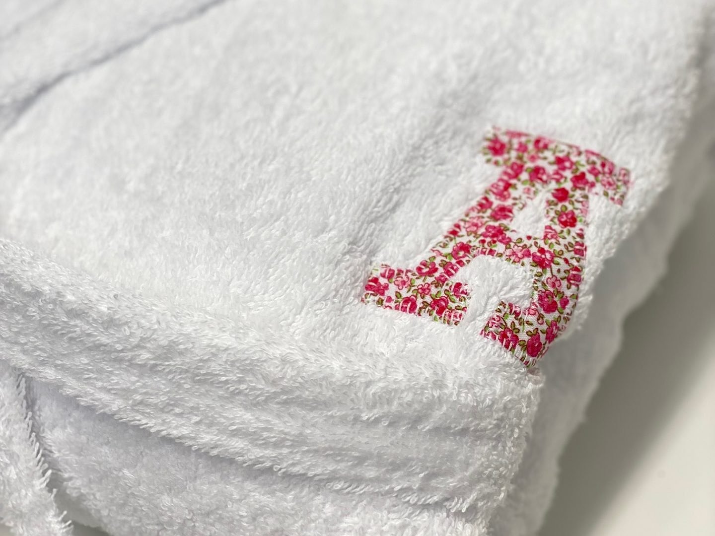 Albornoz personalizado con detalle o inicial, de color blanco, con bolsillos en rizo 100% algodón. Puedes elegir la tela que más te guste para los puños(solo cuando no lleva capucha ) y para el detalle o la inicial.