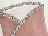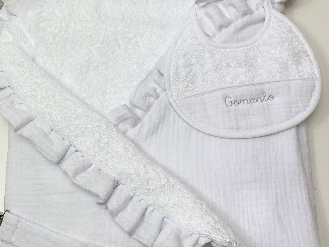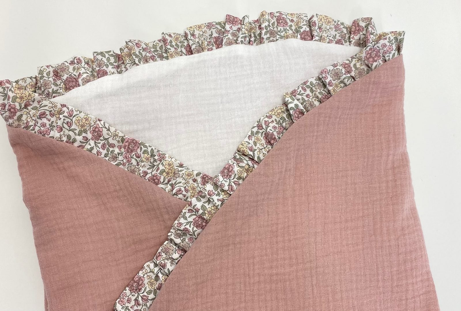 Arrullo de muselina con volante perfecto para la clínica y para usarlo posteriormente para tapar al bebé y mantener así su calor corporal. \n