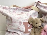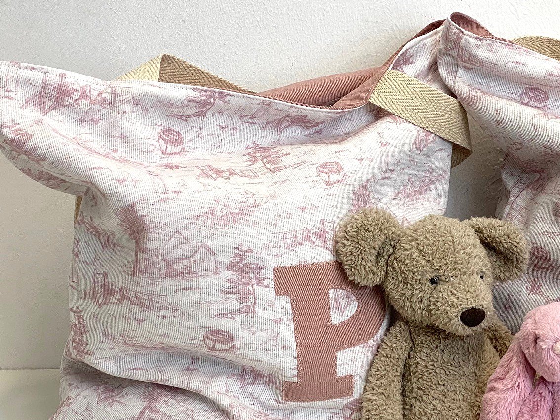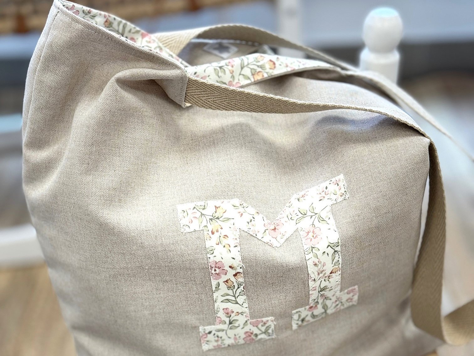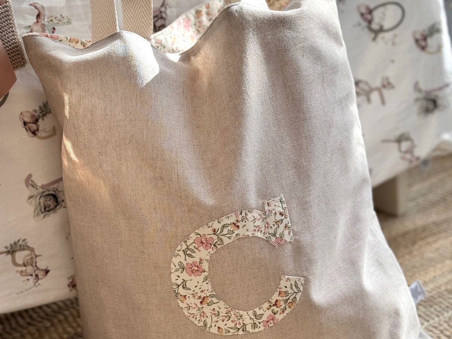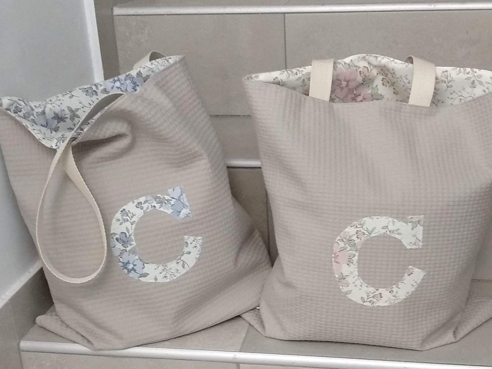 Bolsa shopping reversible con inicial y forro confeccionada en tela.