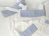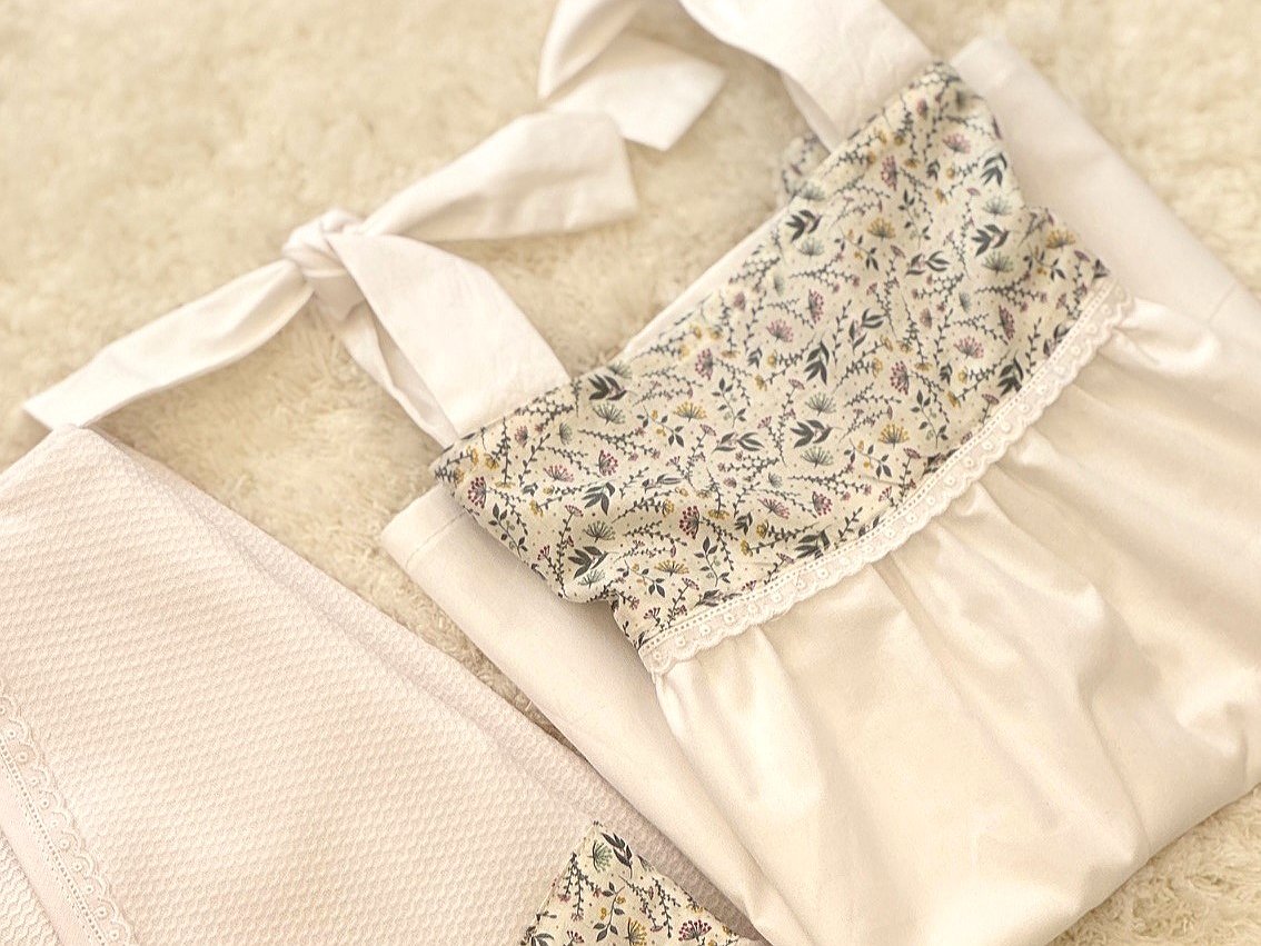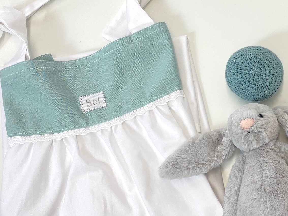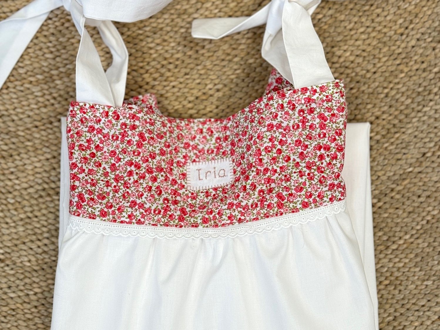 Puedes personalizar la pechera del camisón con la tela estampada que más te guste. Los tirantes son del mismo tejido blanco de la falda y se atan con una lazada que le da al conjunto un toque muy dulce.