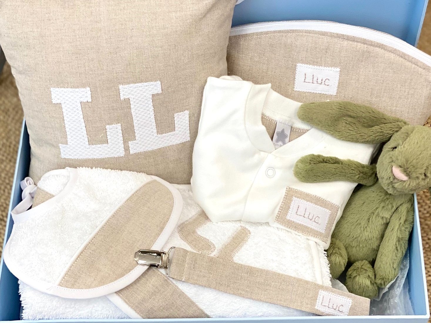 La canastilla regalo bebé está compuesta por 6 productos para el recién nacido.