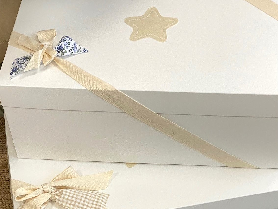 Todos los productos están colocados en una caja del color que quede más bonito en función de la tela que hayas seleccionado. Las medidas de la caja son de: 40x30x15 cm aproximadamente.