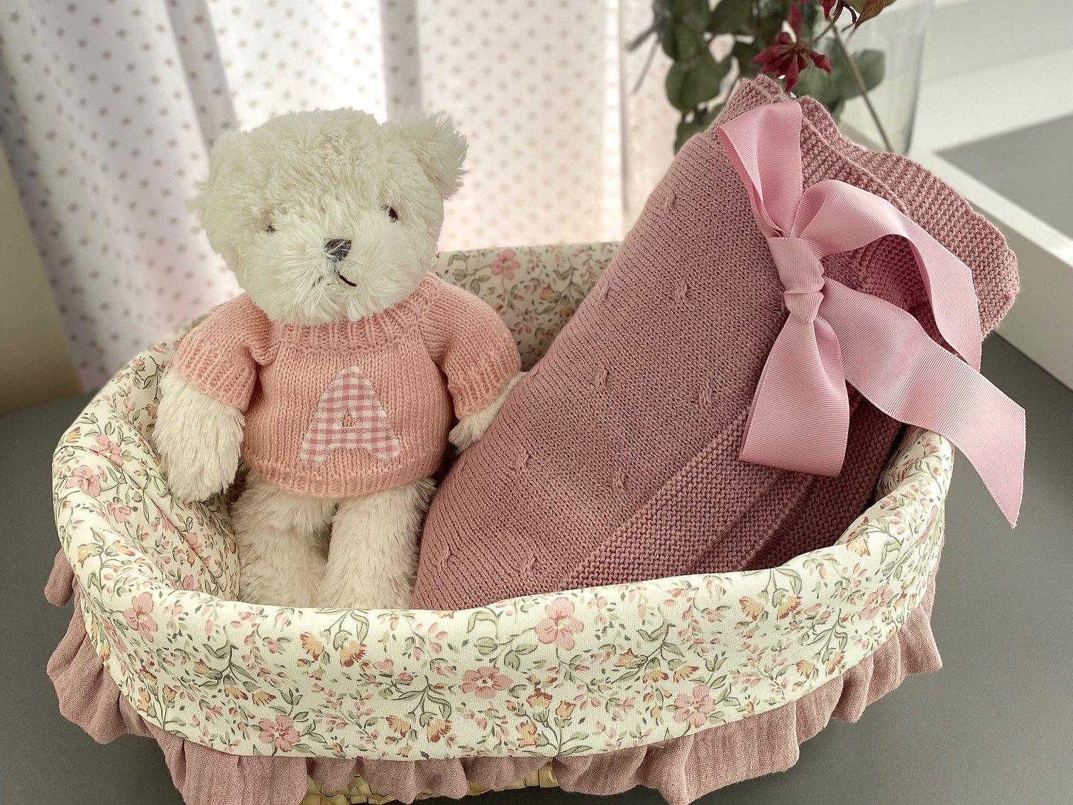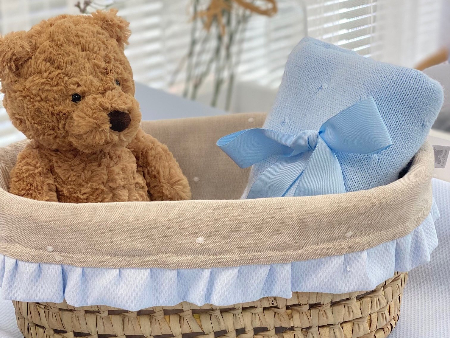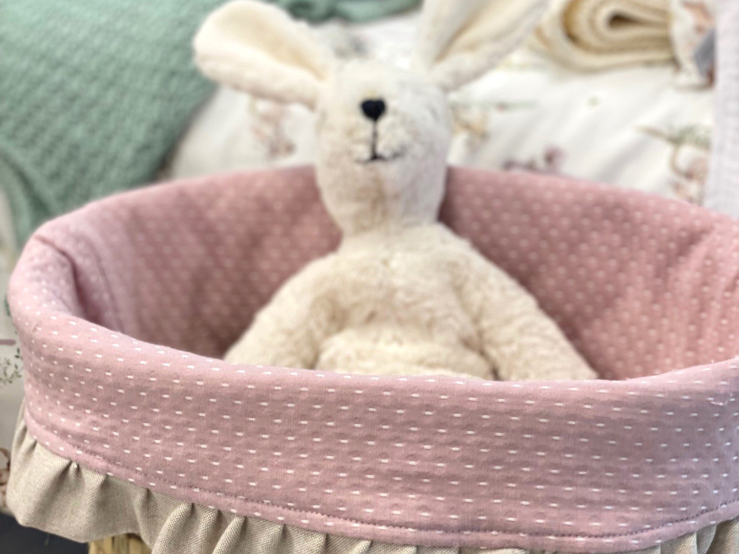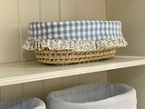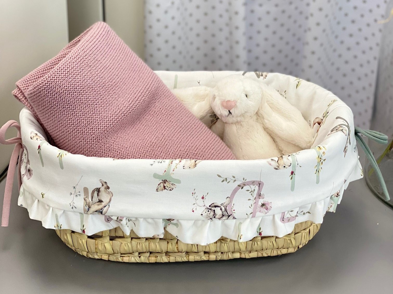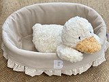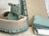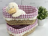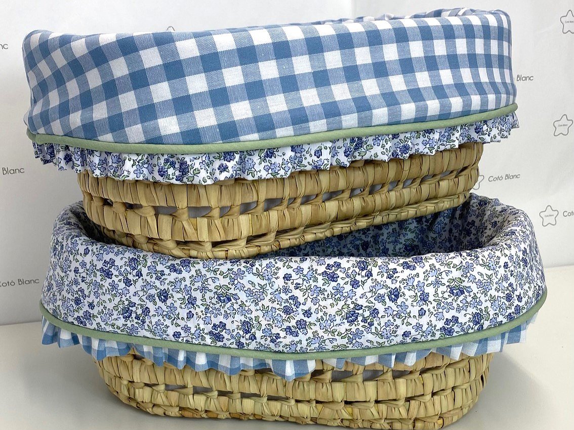 Cesta de palma ovalada para cremas con volante. Coloca dentro lo que necesites tener a mano para tu bebé.