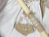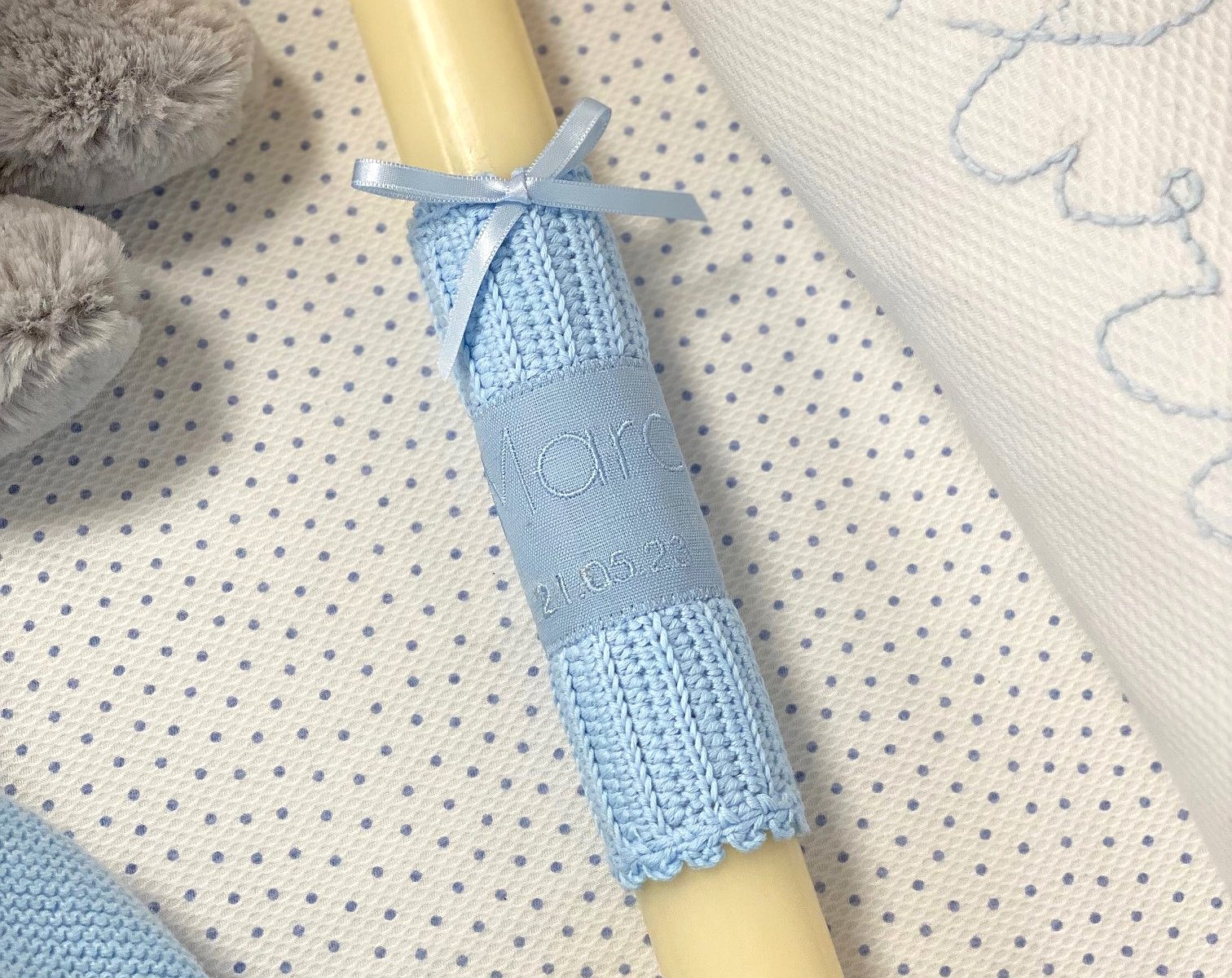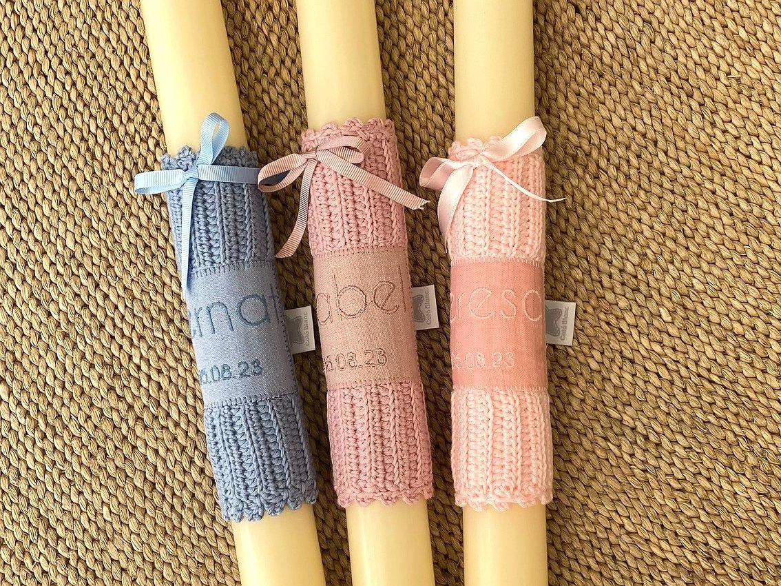 Cirio para bautizo de color blanco roto, abrazado con punto hecho a mano por Cotó Blanc.