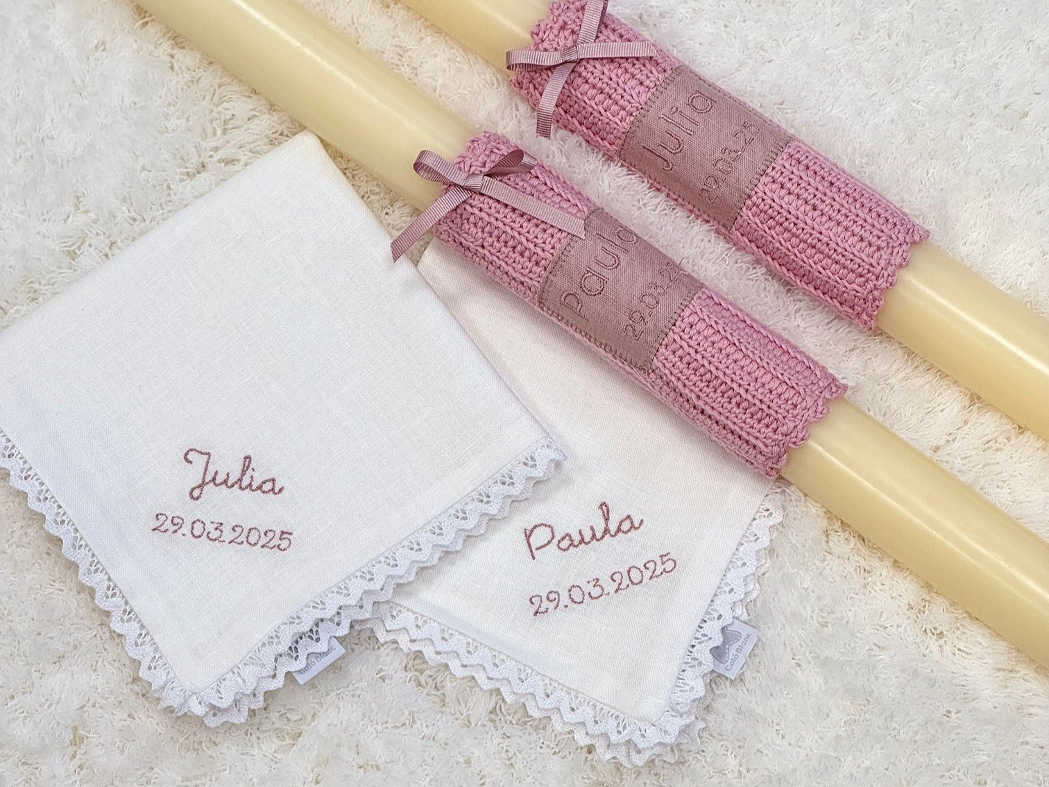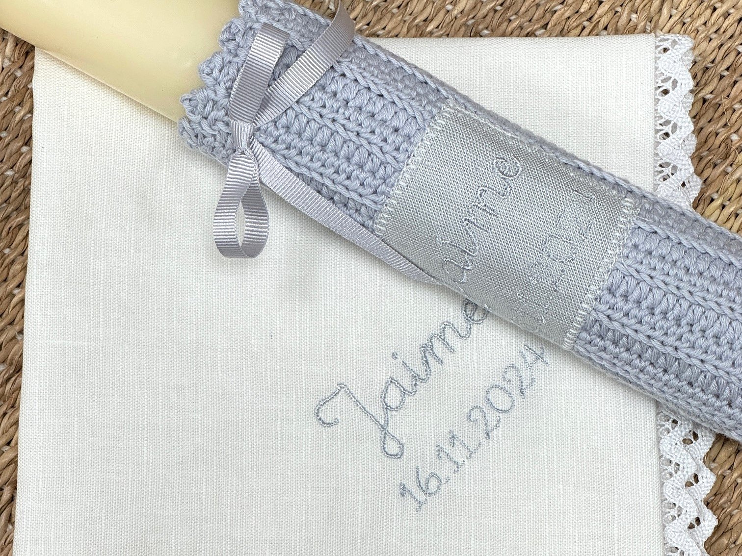 Indícanos lo que quieres que bordemos, nombre, fecha o ambas cosas. Lo haremos todo al tono. \n \nMedida del cirio 50 cm x 3,5 de diámetro.