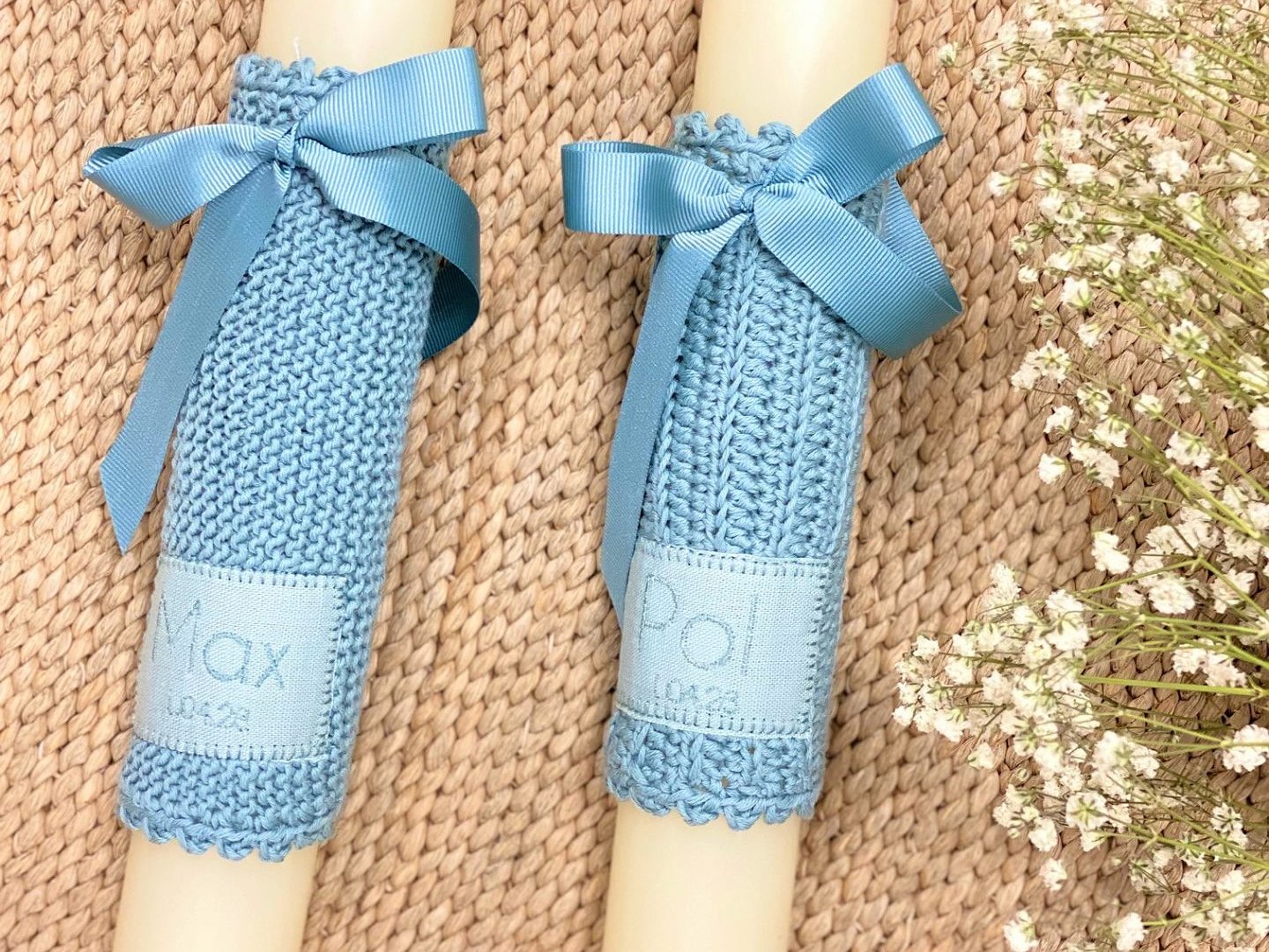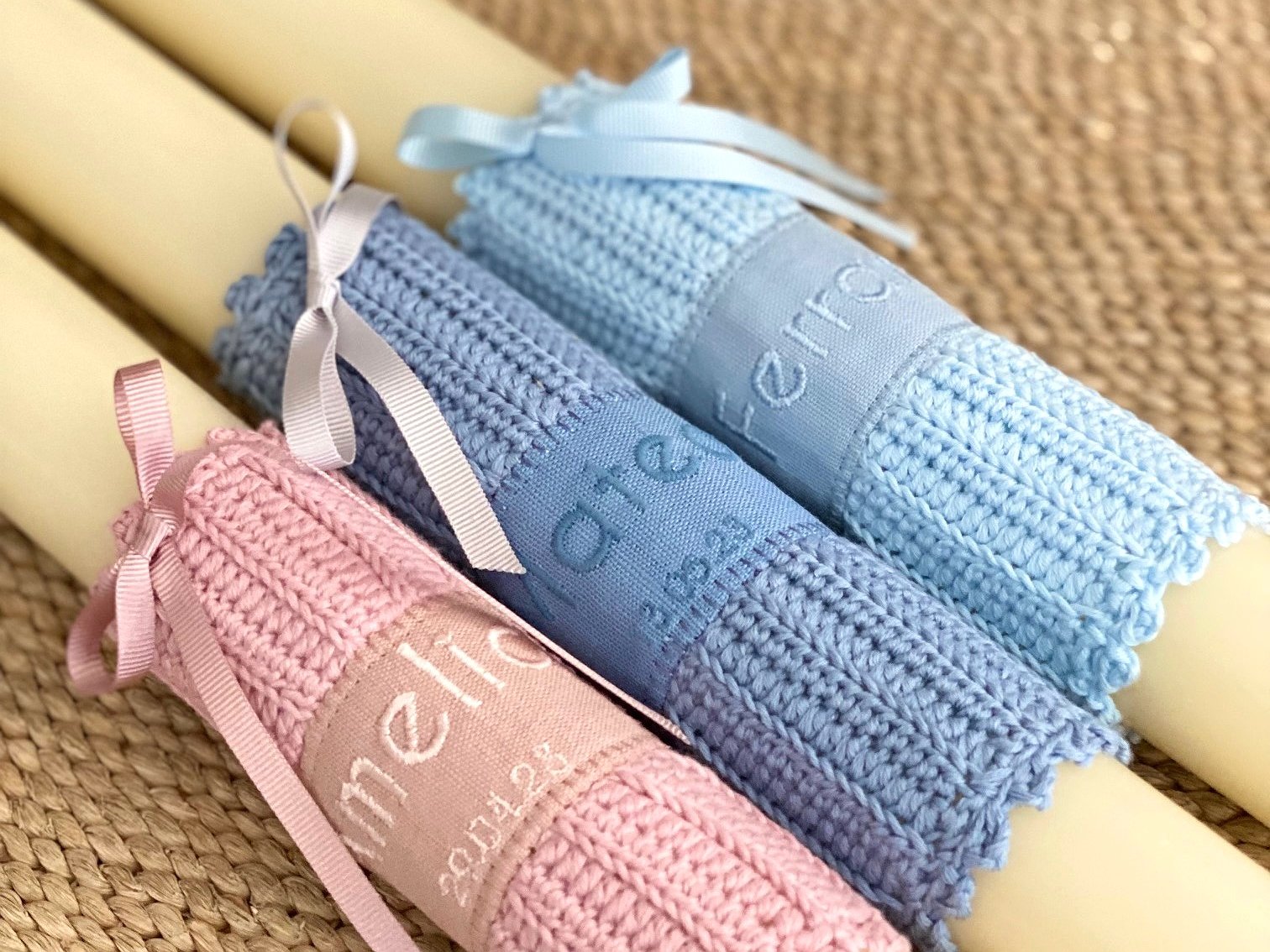 Puedes escoger nuestro cirio bautismal entre los colores que te mostramos : Rosa bebé, Rosa empolvado, Azul azafata, Arena, Azul cielo, verde smoke, gris o blanco.