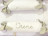 Elige el color del hilo para bordar, la tela del cojín entre las telas que te proponemos , la tela de los lazos que más te guste, e indícanos el nombre que quieres que bordemos a máquina.