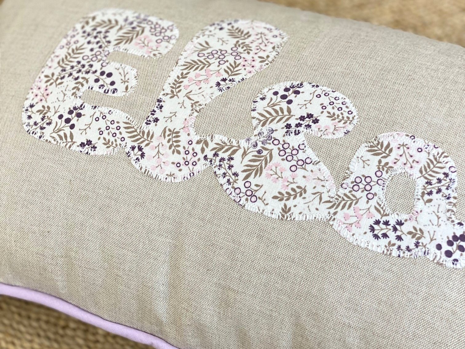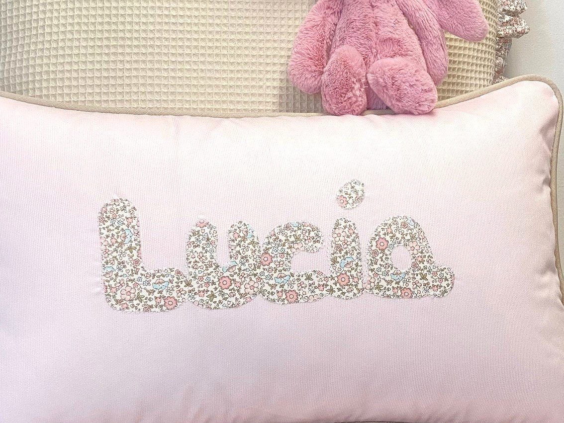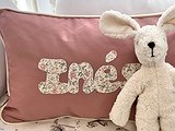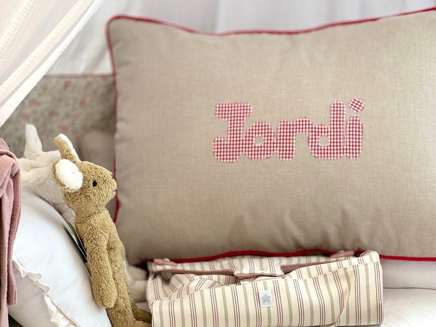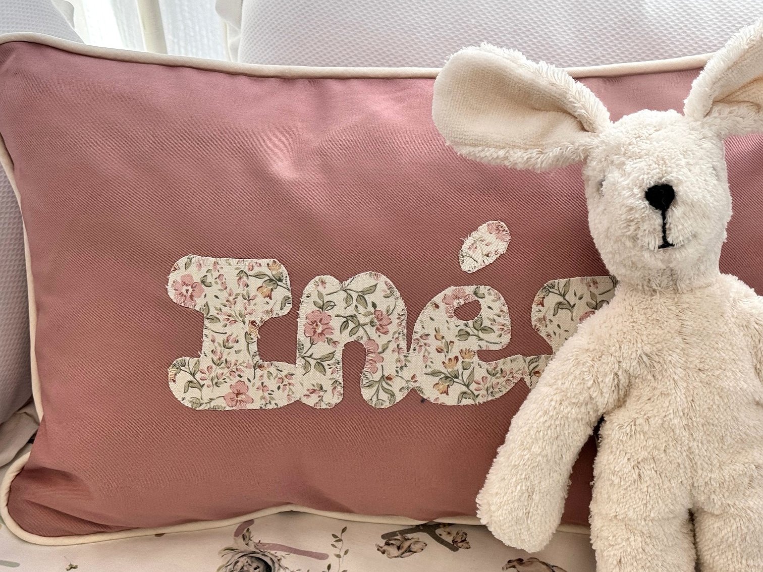 Cojín con nombre aplicado en tela y personalizable con la tela que más te guste.