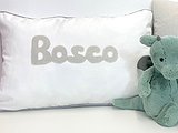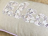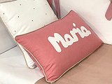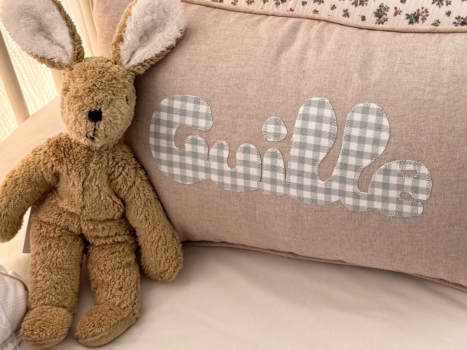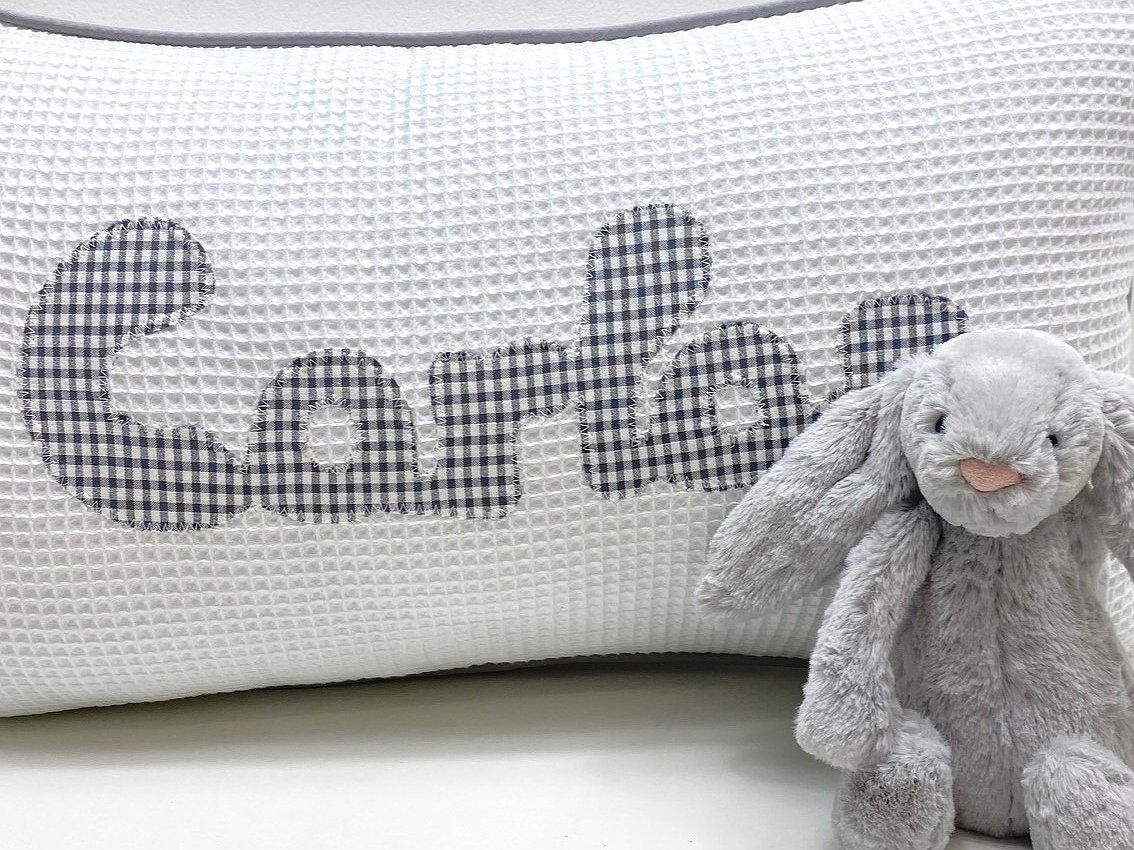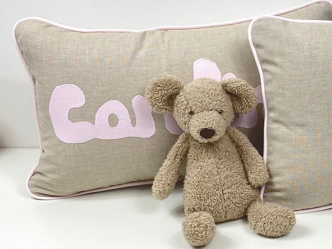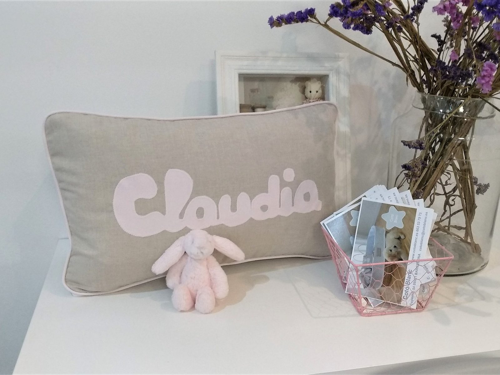 Cojín con nombre aplicado en tela y personalizable con la tela que más te guste.