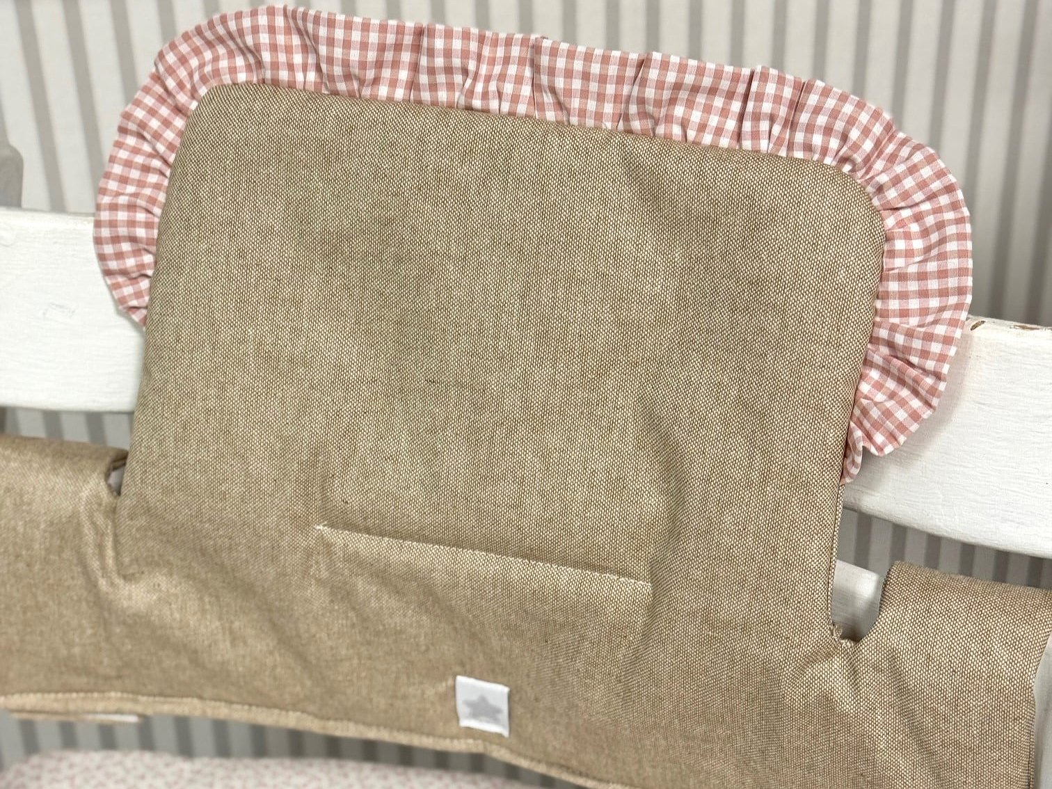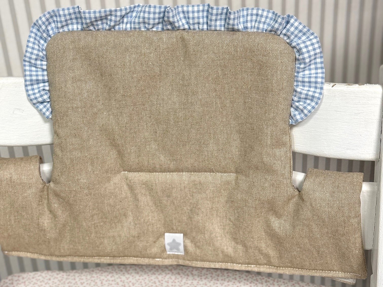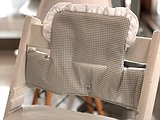 Cojín Trona Stokke Tripp Trapp resinado con volante personalizado con las telas que más te gusten. Se compone de las dos piezas, asiento y respaldo.