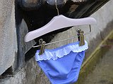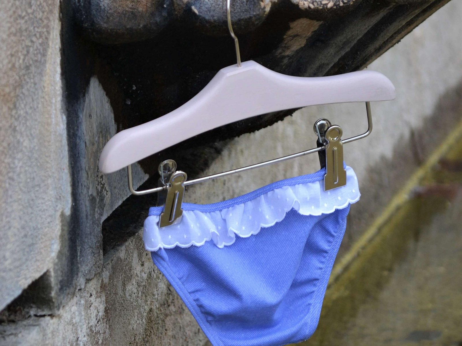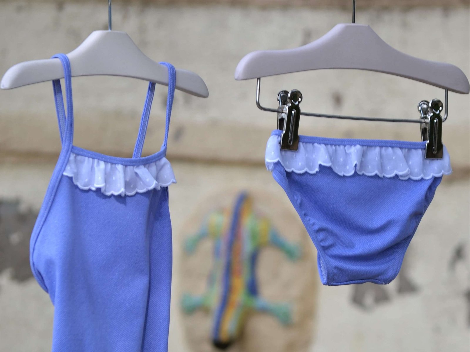 Culetín niña azul y plumeti. Se trata de una braguita-bañador confeccionado en lycra de color azul clarito. Un diseño que se caracteriza por la puntilla de plumeti blanca situada en la zona de la cintura.
