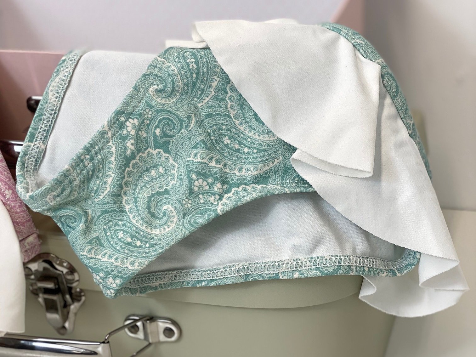 Culetín niña cashmir rosa o verde con volante blanco en todo su alrededor.