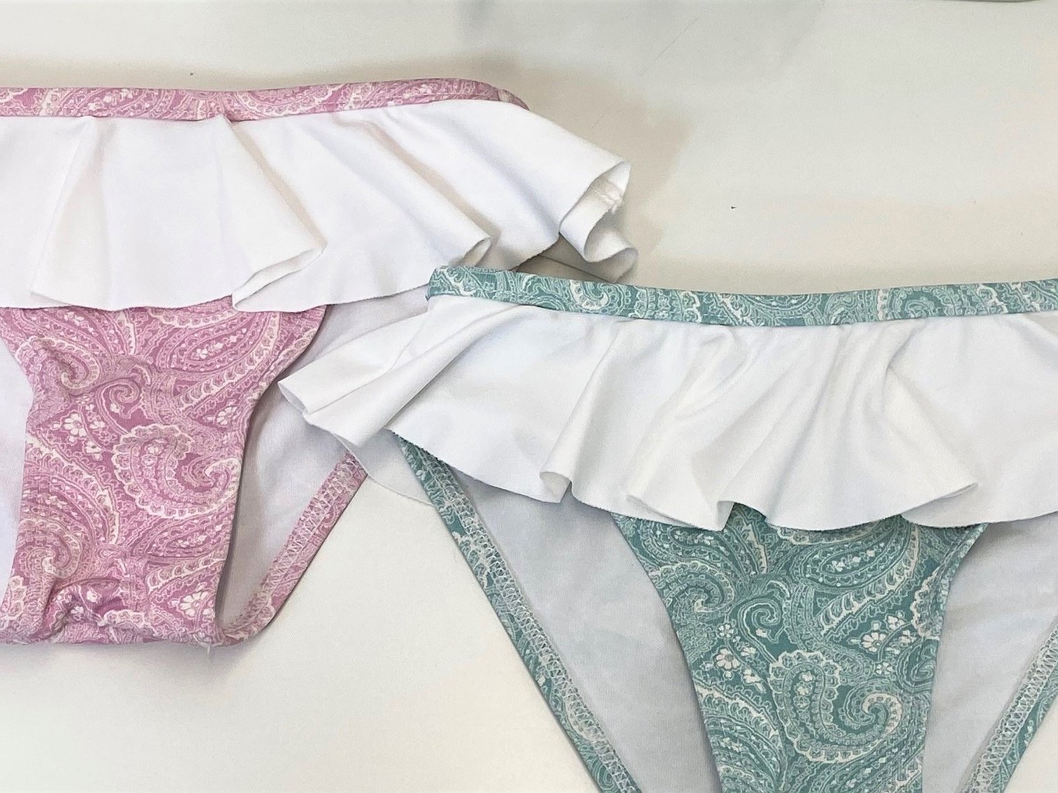 Tenemos disponible también el Bañador niña cashmir rosa o verde con volante blanco a conjunto.