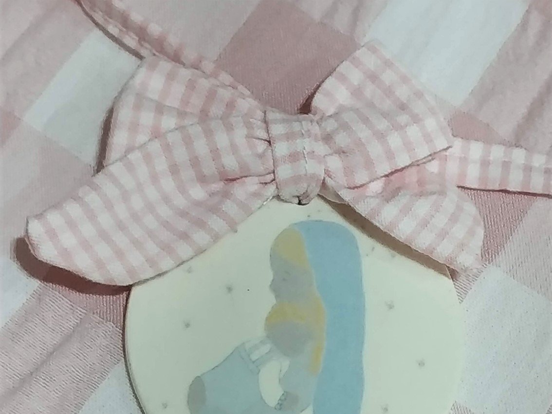 Hecha en cerámica de unos 5 cm de diámetro, con dibujo exclusivo de la virgen con un mini cliente Cotó en brazos.