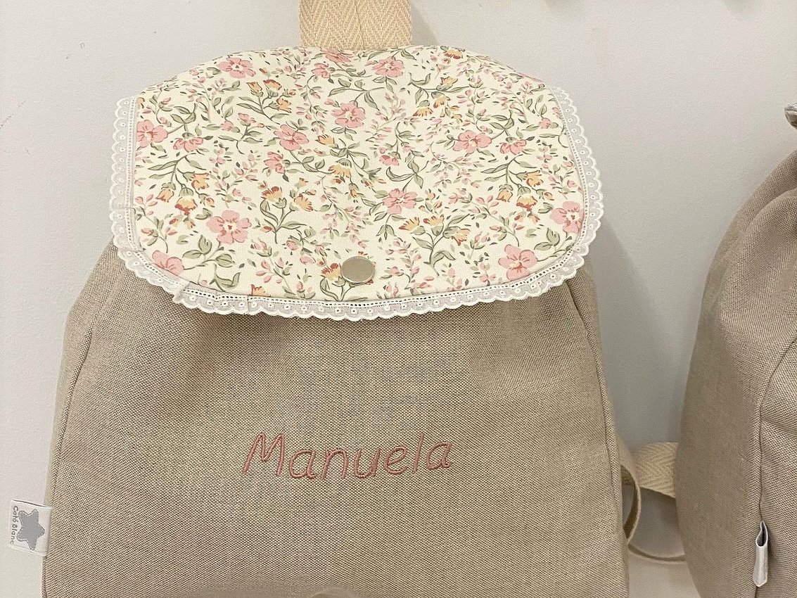 La base de la mochila es en color lino natural. La puntilla es de aprox 1 cm de bordado suizo, que puede variar el acabado según stock.