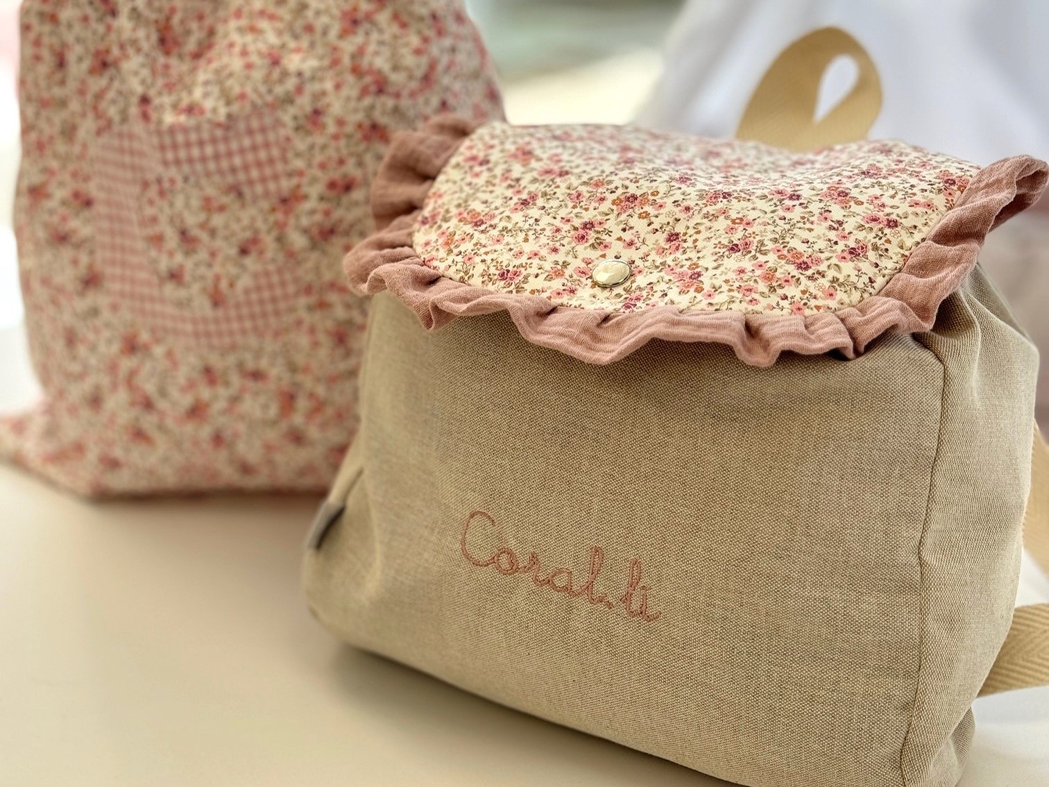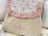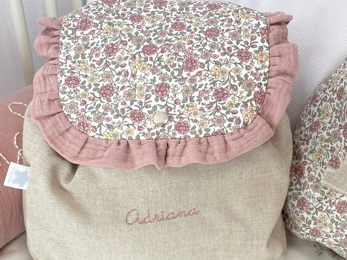 Mochila guardería de tela con volante y nombre bordado a máquina