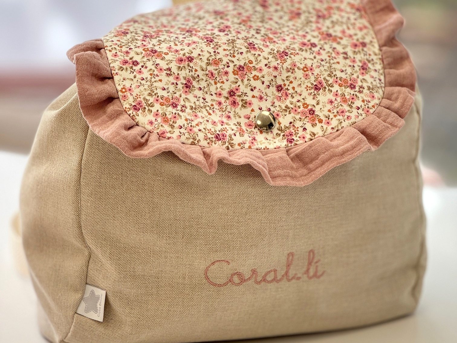 Mochila guardería de tela con volante y nombre bordado a máquina.