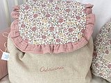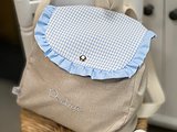 El bordado del nombre del niño o de la niña está incluido. Si la prefieres sin bordado la encontrarás en el articulo Mochila Guardería de tela con volante