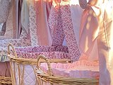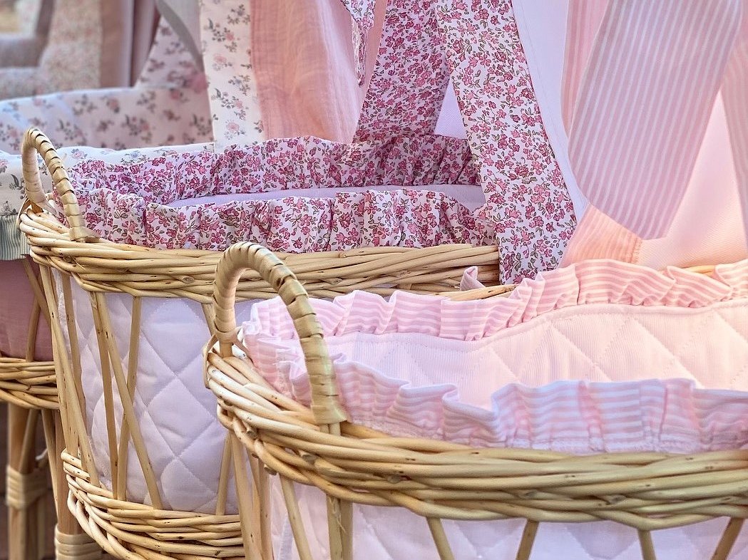 El moisés lleva un lazo en el dosel. Lleva colcha.