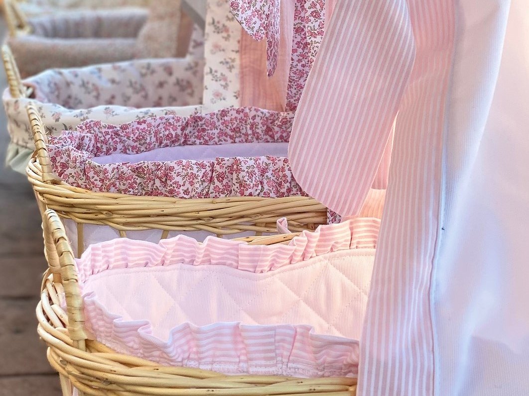 La estructura del moisés es de mimbre, con vestiduras de tela, dosel y lleva ruedas en color blanco para una mayor movilidad.