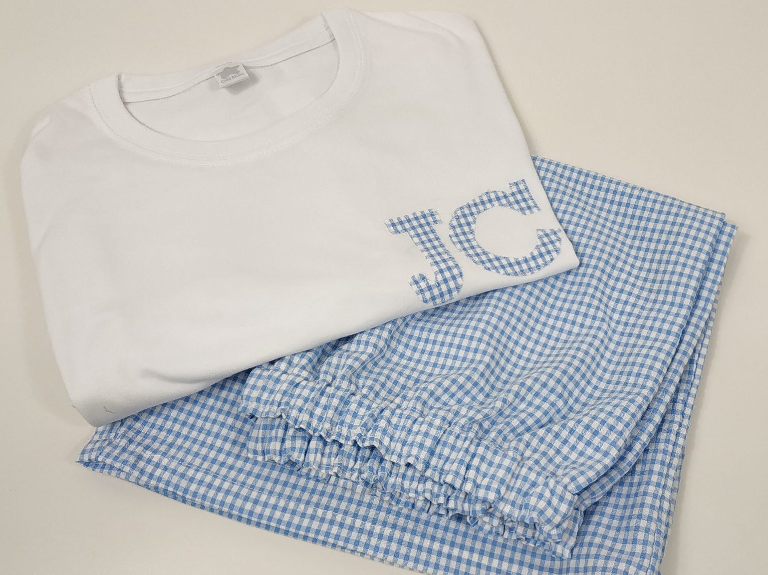 Pijama adulto con camiseta invierno personalizado. Compuesto por una camiseta de manga larga de algodón 100% y pantalón largo del tejido que tu elijas. La camiseta, siempre es de color blanca y puedes elegir o bien el detalle, la inicial o dejarlo sin nada. Una vez hayas decidido, deberás elegir la tela que más te guste y te confeccionamos tu pijama. Puedes conjuntarlos con los pijamas de niño de Cotó Blanc. Pijama niños invierno con camiseta Si alguna tela no está pregúntanos sobre su posibilidad! Las camisetas son unisex y tallan etas. Elige el modelo (Hombre-mujer) la talla, el detalle o inicial (solo una opción, o detalle o inicial) y la tela que más te guste.