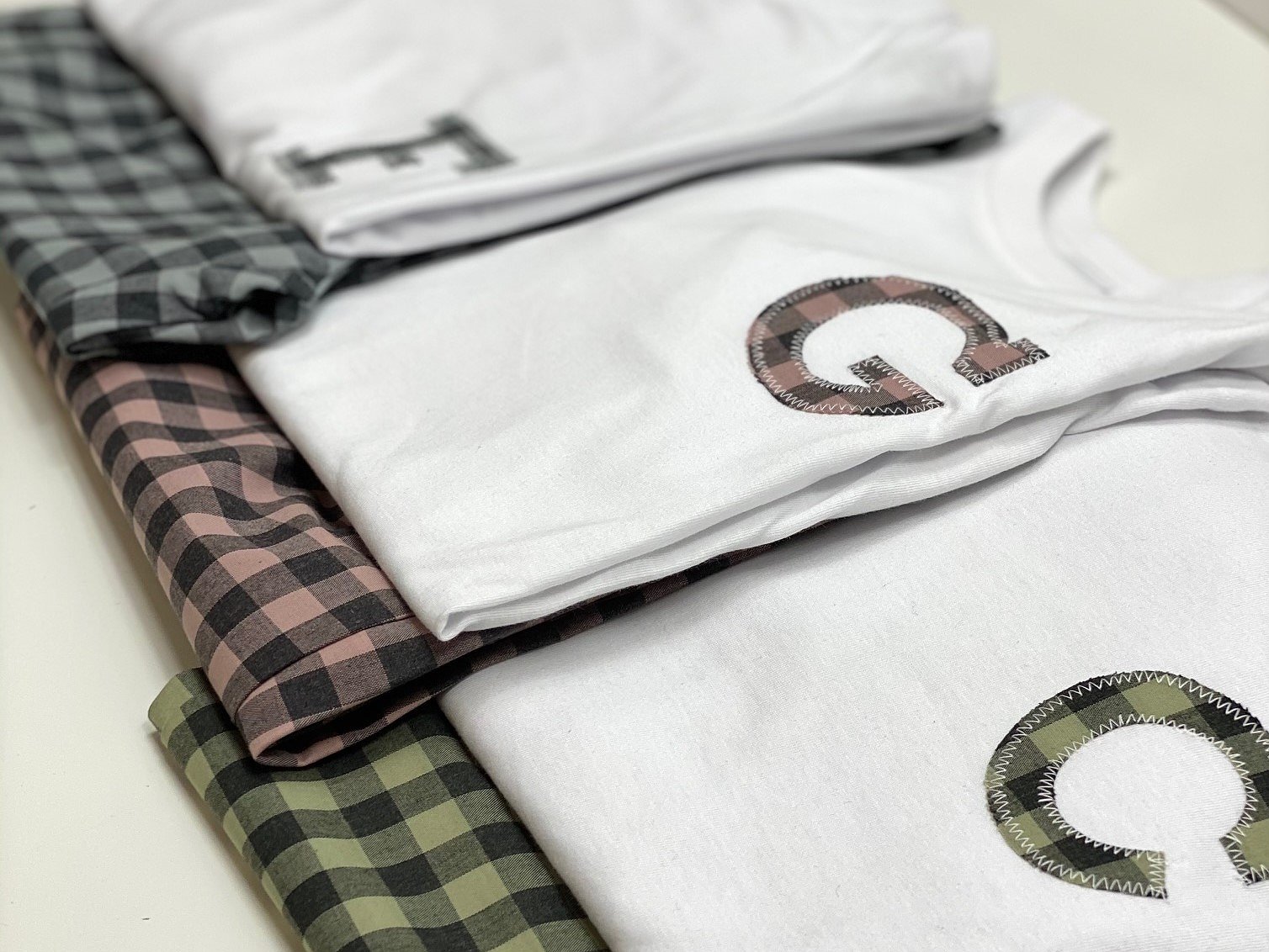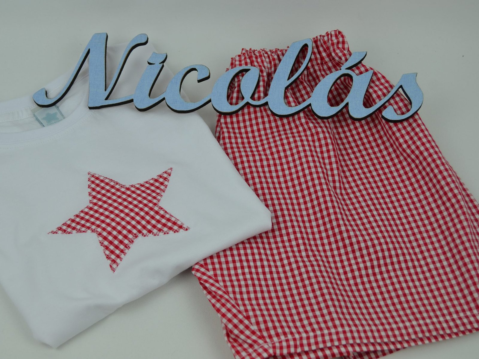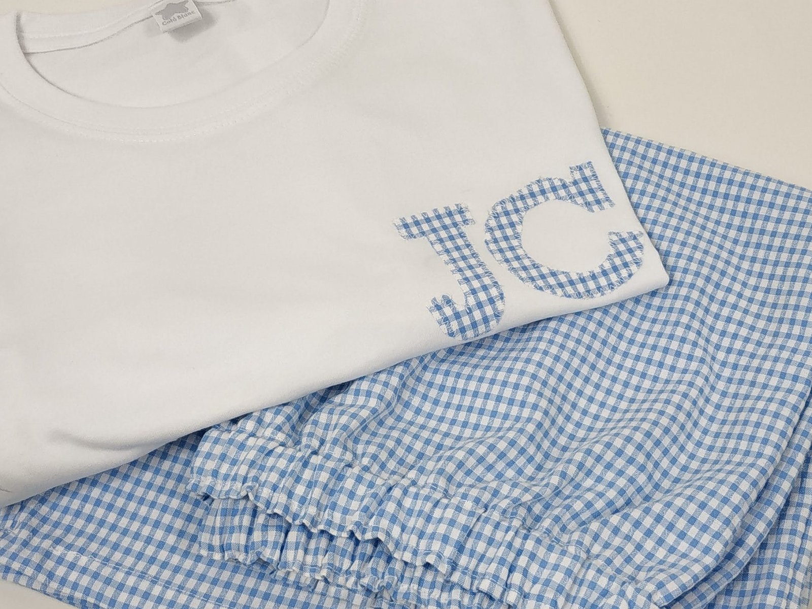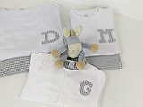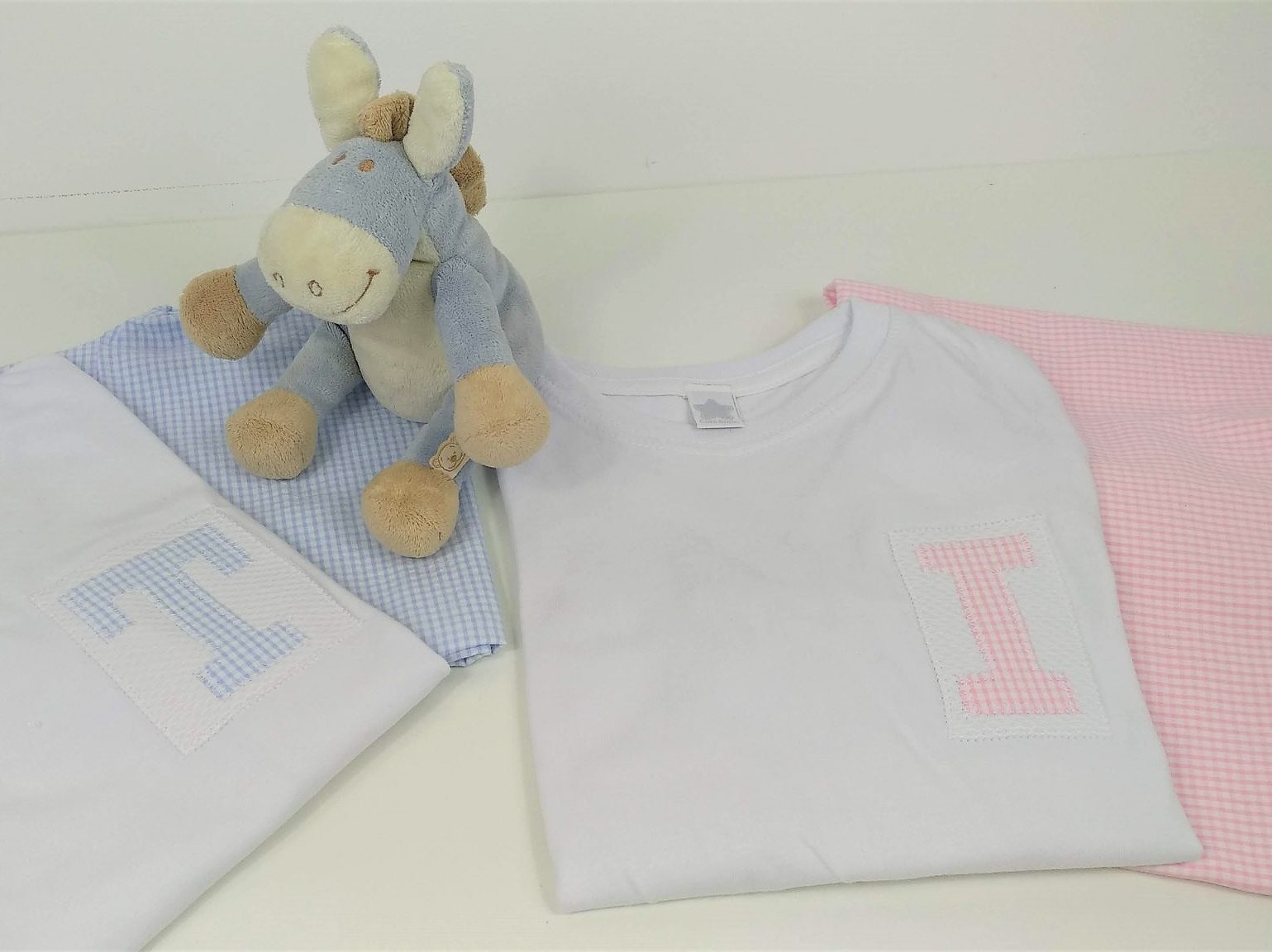 Elige la talla, el detalle o inicial que quieras (solo una opción o inicial o detalle) y la tela. El detalle irá en el centro, la inicial irá a un lado de la camiseta.