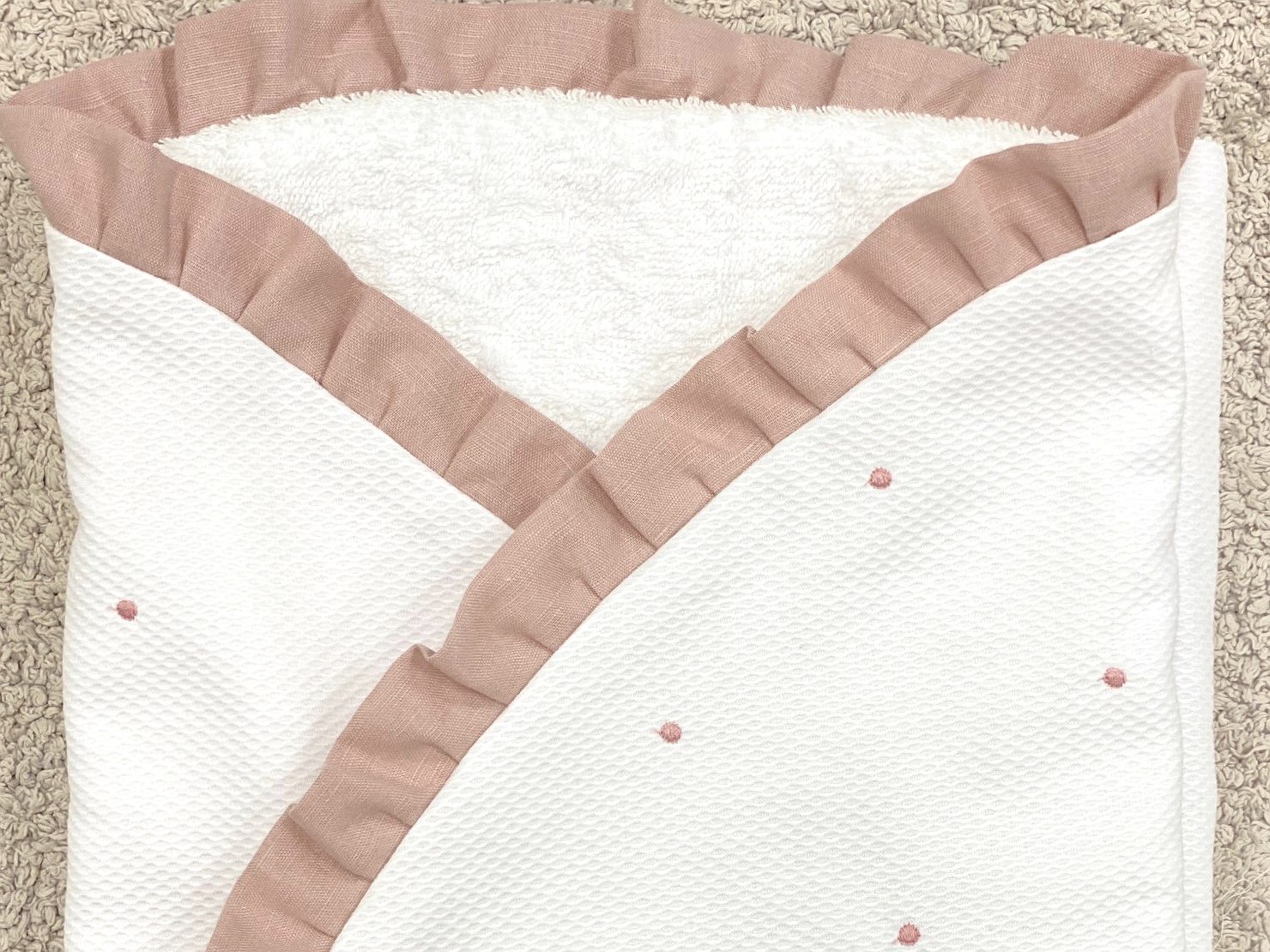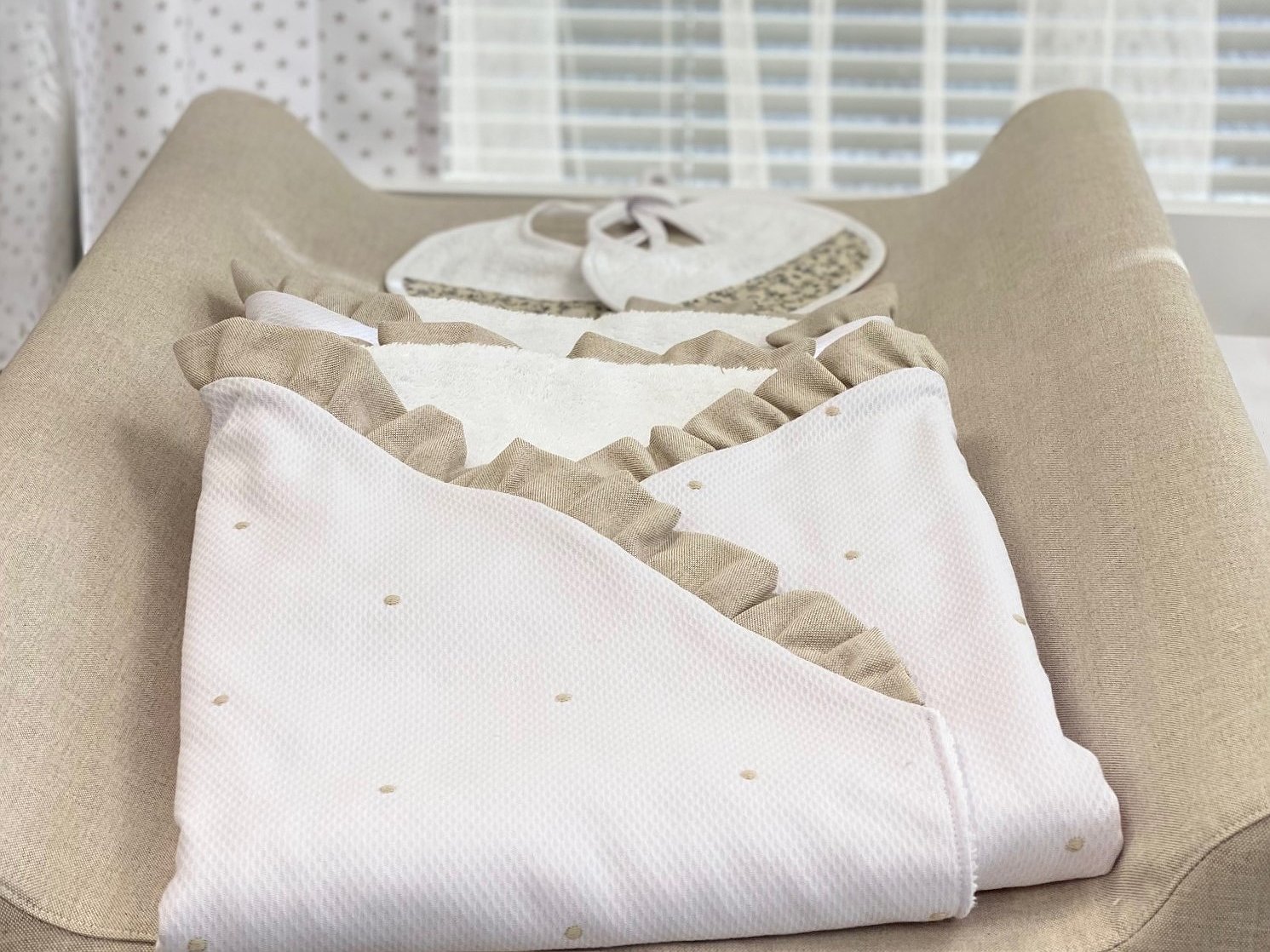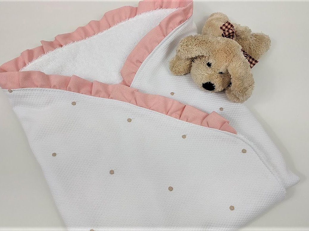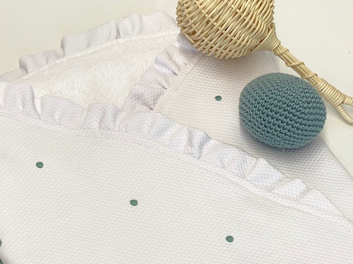Arrullo piqué bodoque con volante perfecto para la clínica y para usarlo posteriormente para tapar al bebé y mantener así su calor corporal.