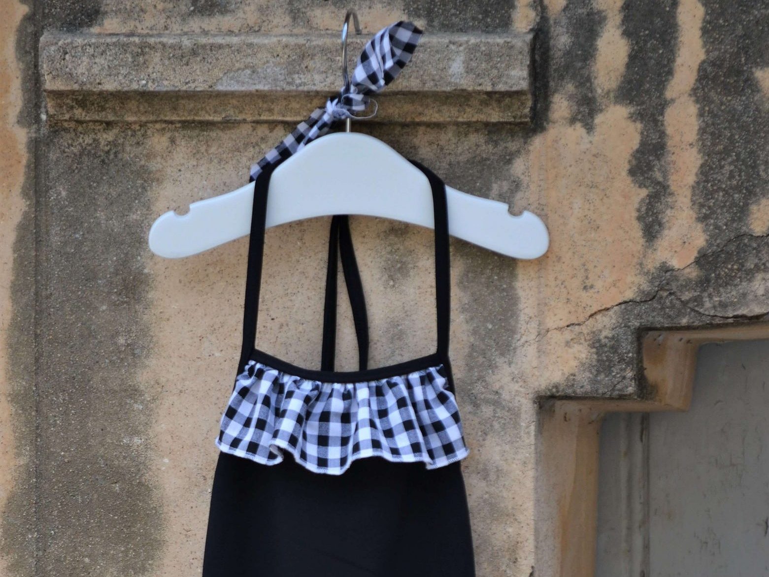 Bañador niña cuadros vichy con volantito en la parte frontal y con tirantes finos. Un imprescindible con mucho estilo para que las más pequeñas disfruten de la playa y de la piscina.