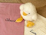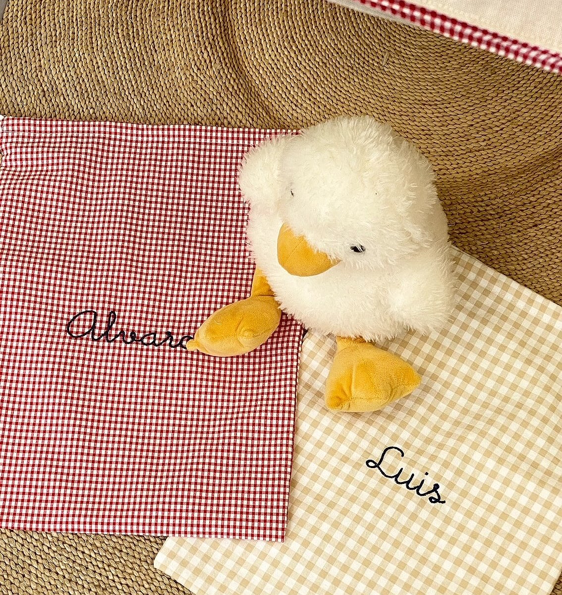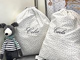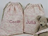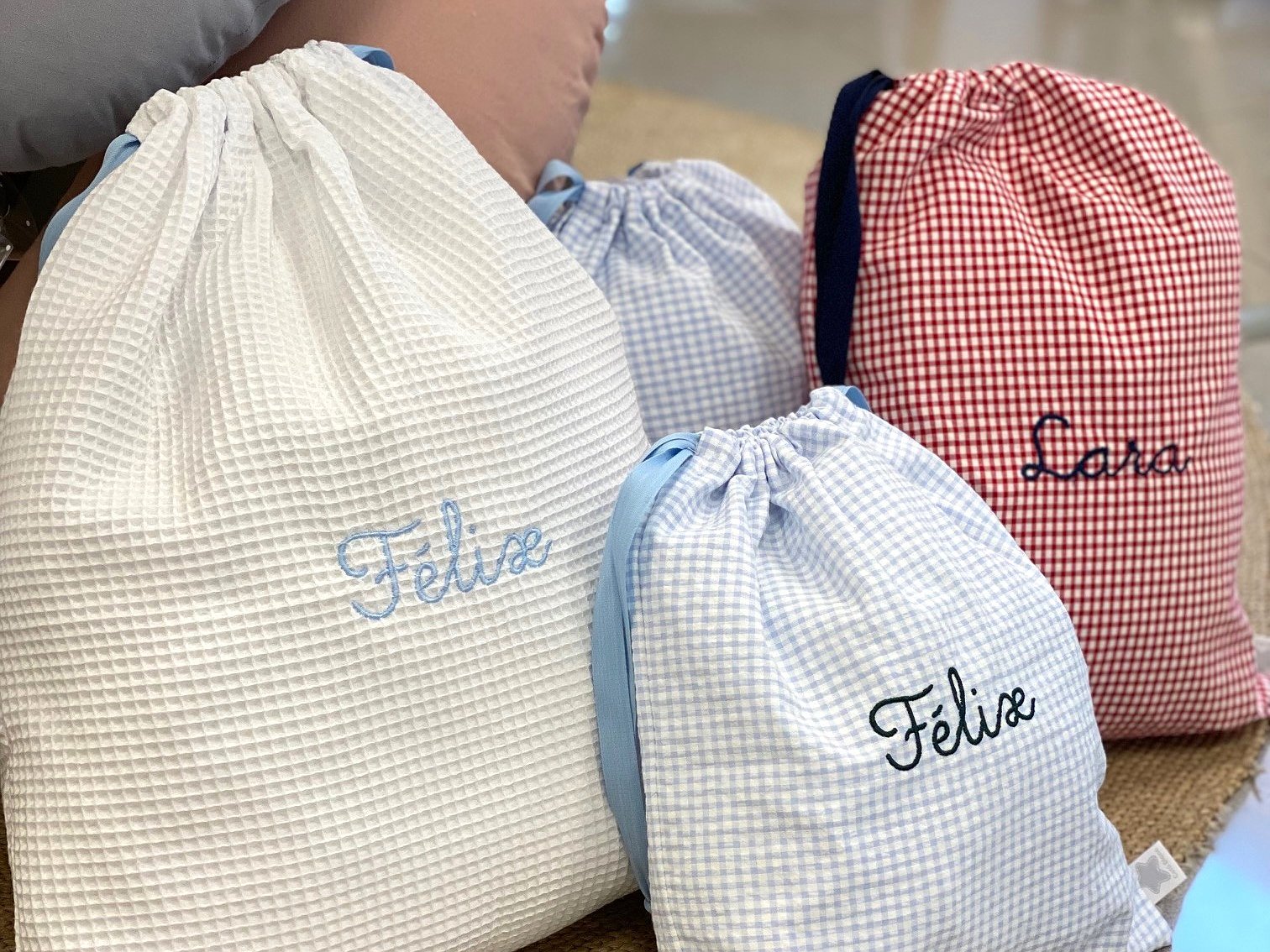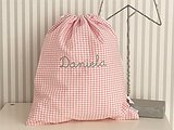 La bolsa se cierra con dos cintas y lleva el nombre bordado en el color que más te gusten la parte frontal.