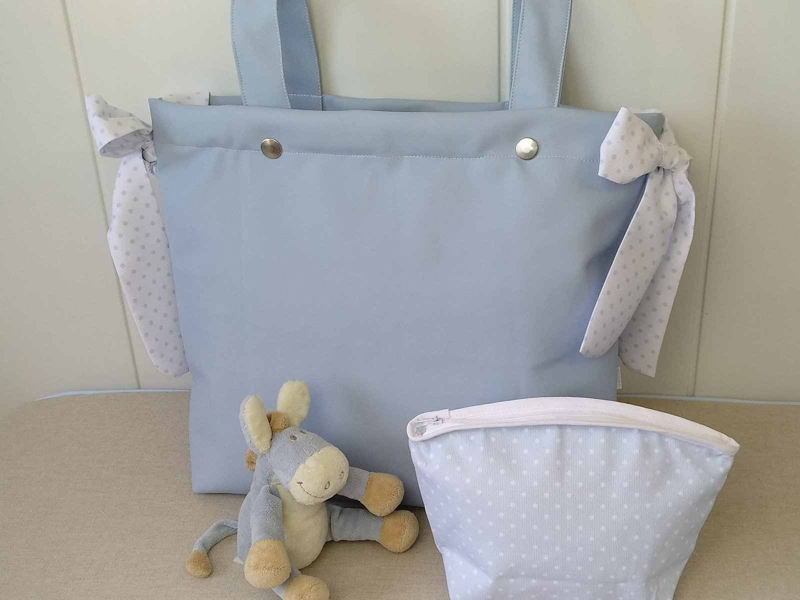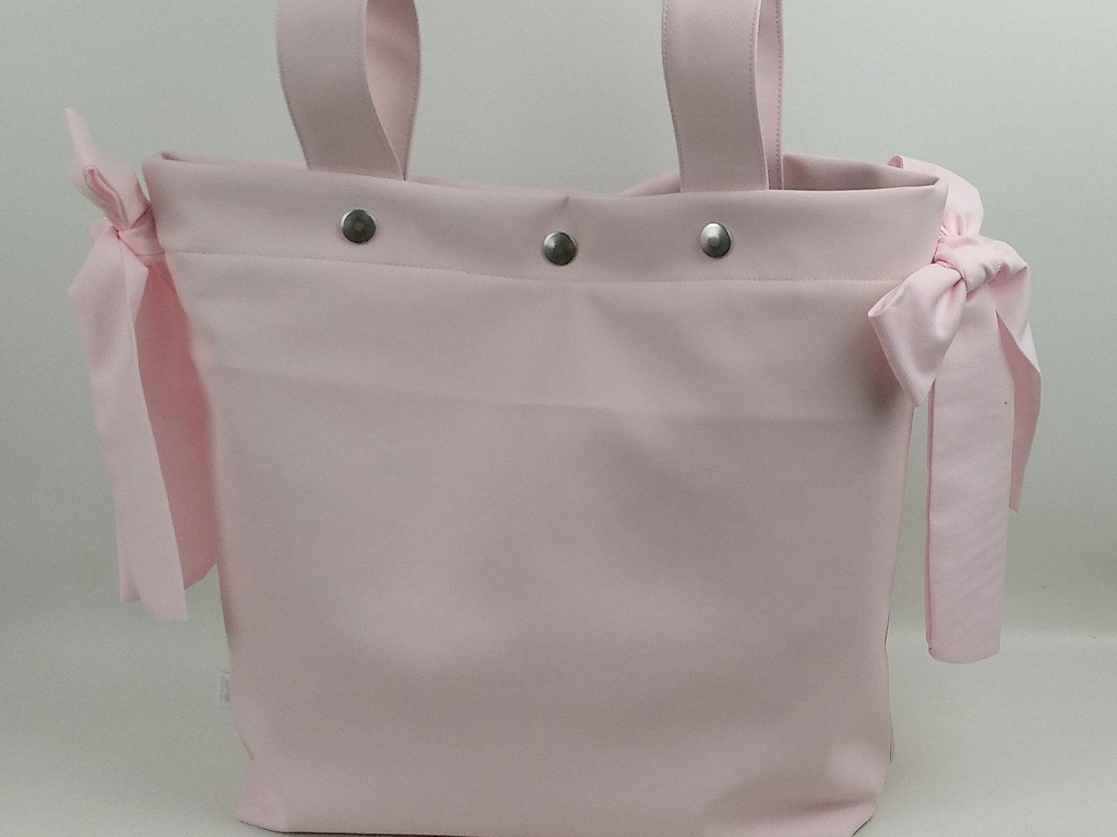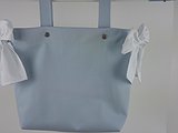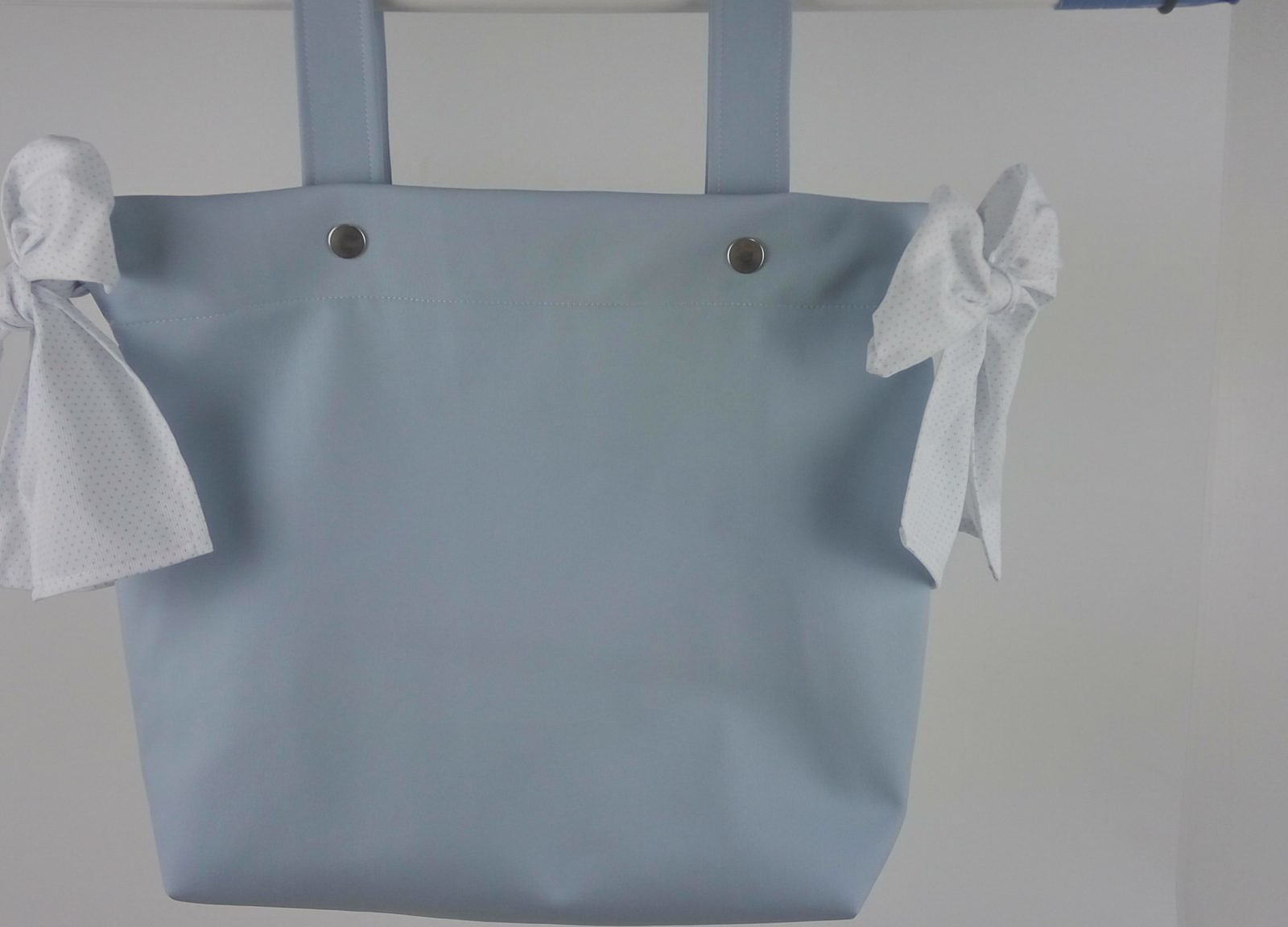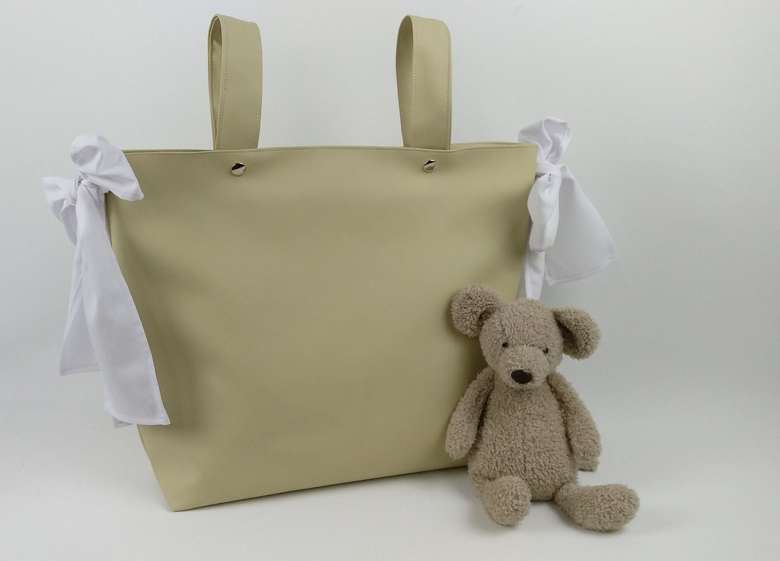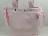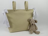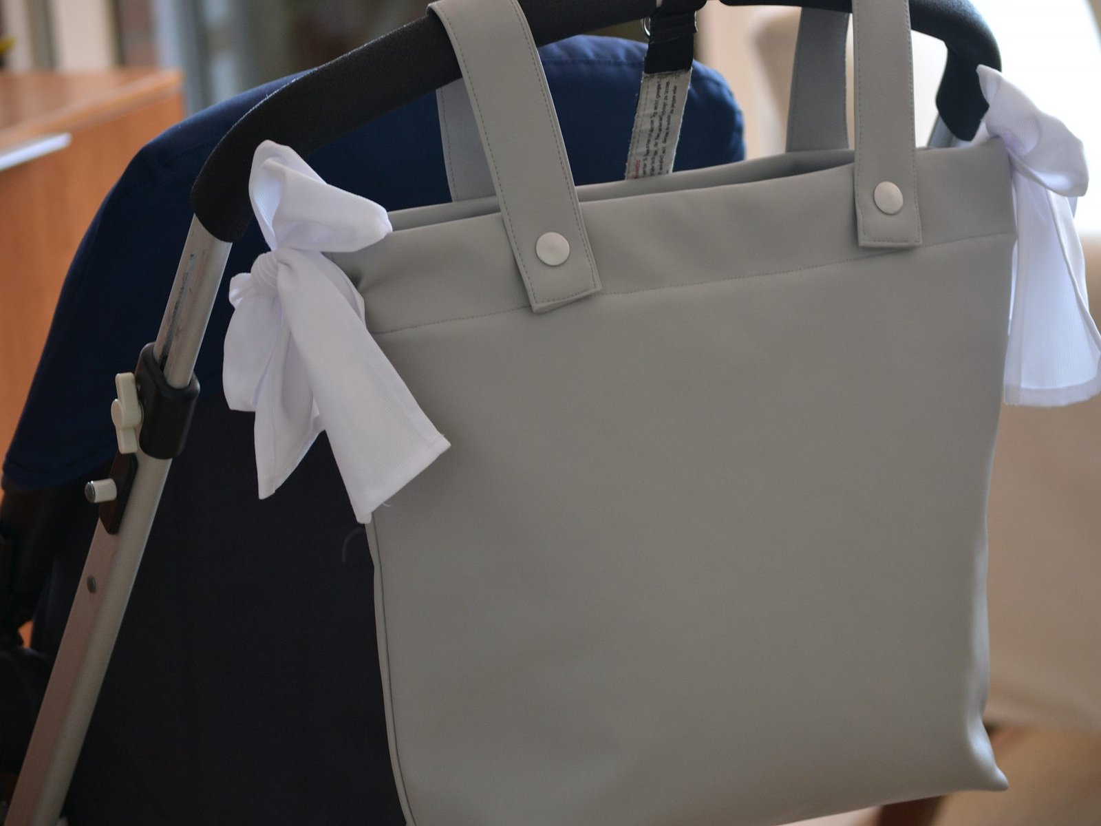 Bolsa panera para cochecito en polipiel que lleva dos asas para que la puedas sujetar al manillar , y otra larga para poderla colgar del hombro en el momento de cargarla.