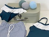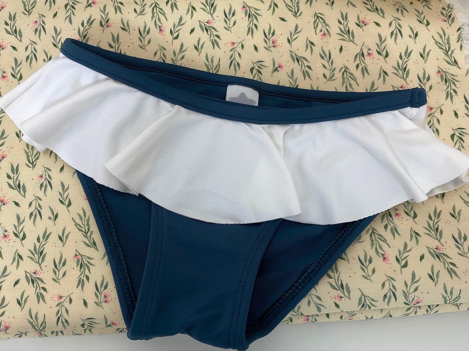 Se trata de una braguita- culetin confeccionado en lycra de color verde . Un modelo que se caracteriza por su volantito de color blanco que se sitúa alrededor de la cintura.