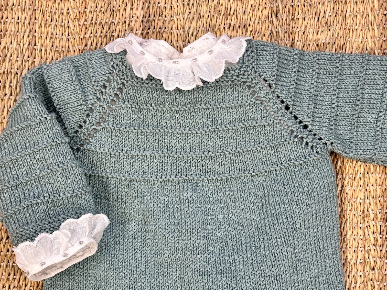 Jersey hecho a mano en punto de algodón, de textura muy suave y agradable para tu peque. Medida de recién nacido, aunque el punto al darse te durará.