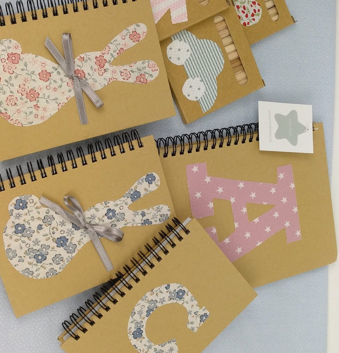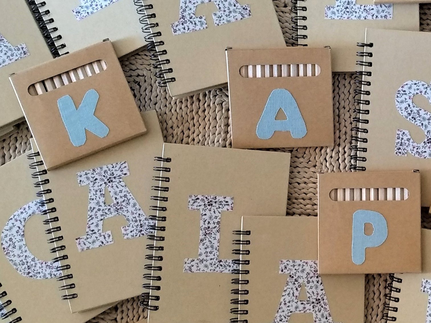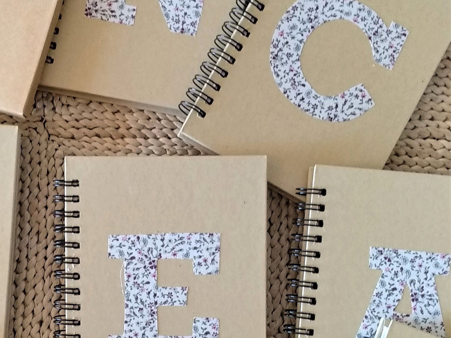 Libreta personalizada con inicial . Todas ellas son con tapa dura de cartón y espiral, en su interior las hojas llevan rayas horizontales.