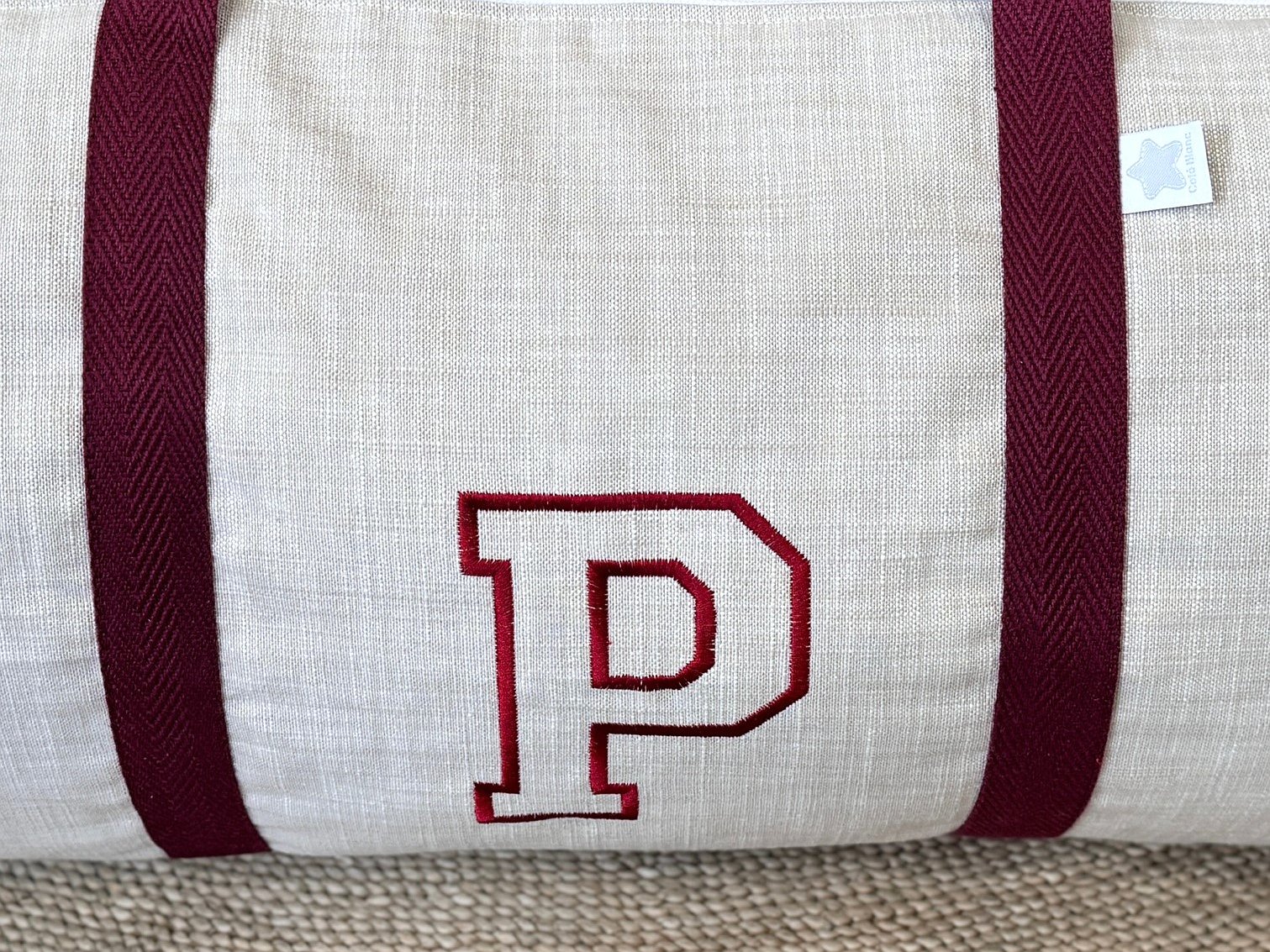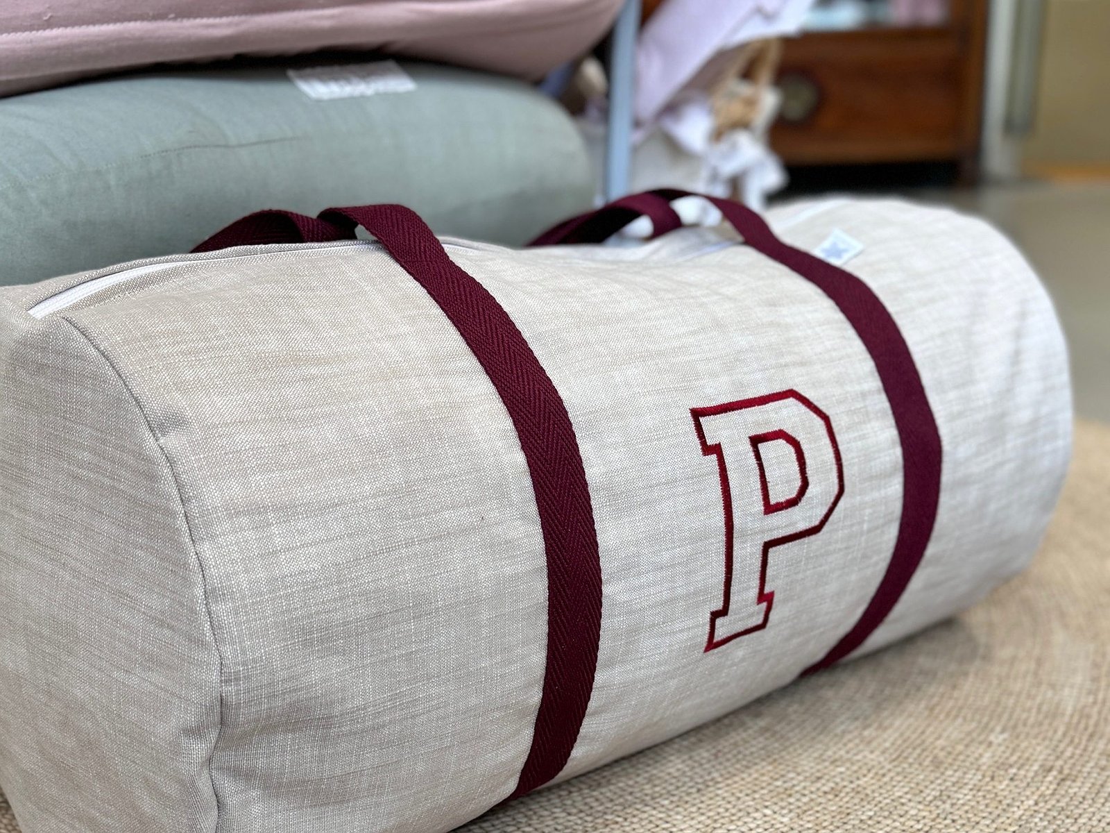 Macuto weekend con inicial bordada tipo oxfort personalizado con la tela que más te guste acolchada y con asas de mano para coger.