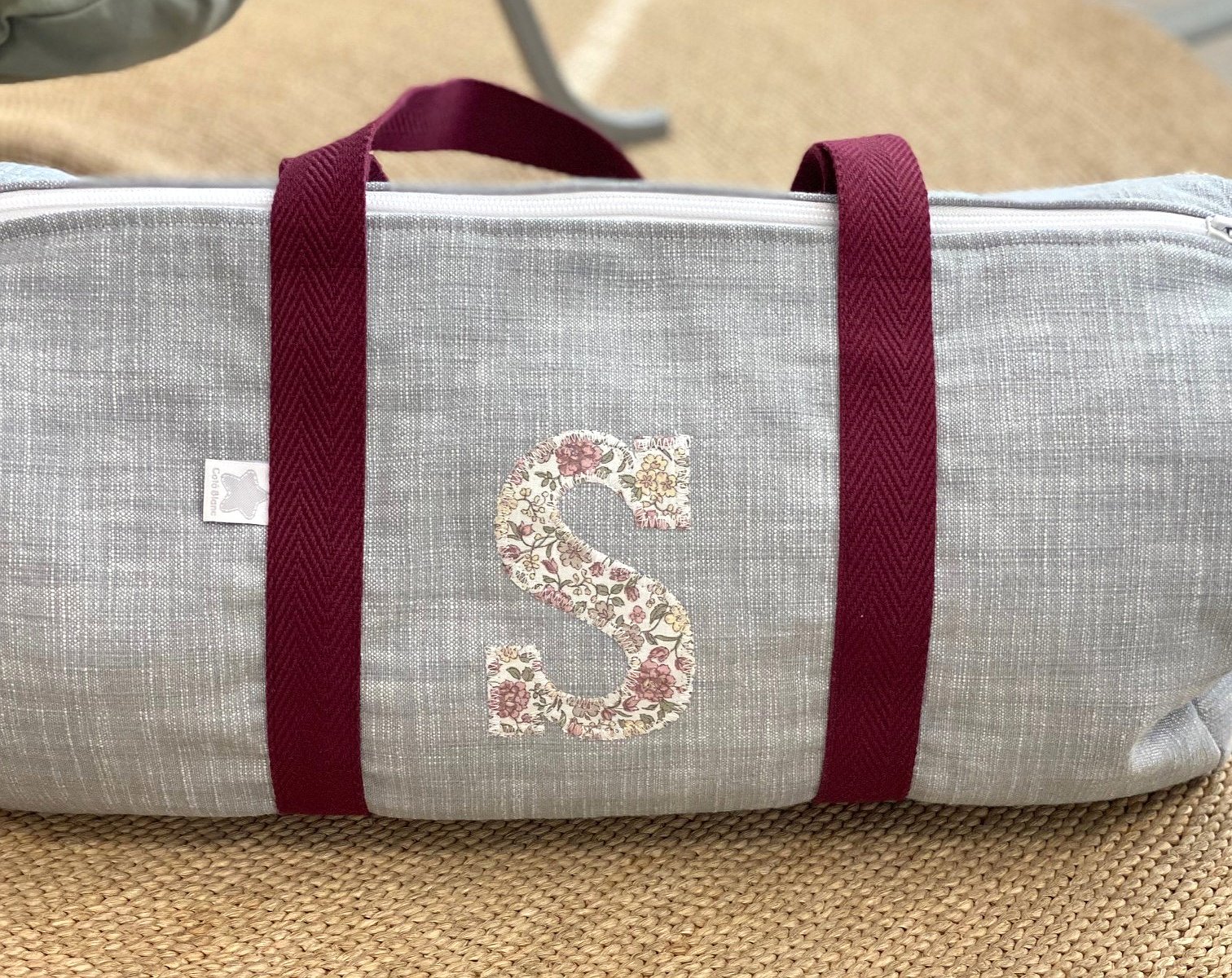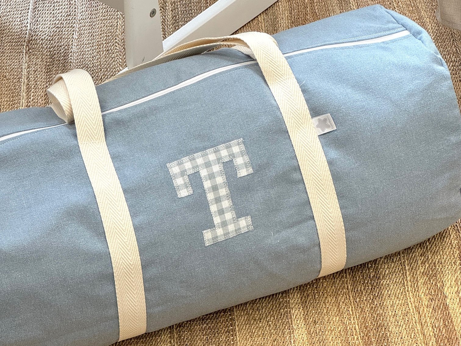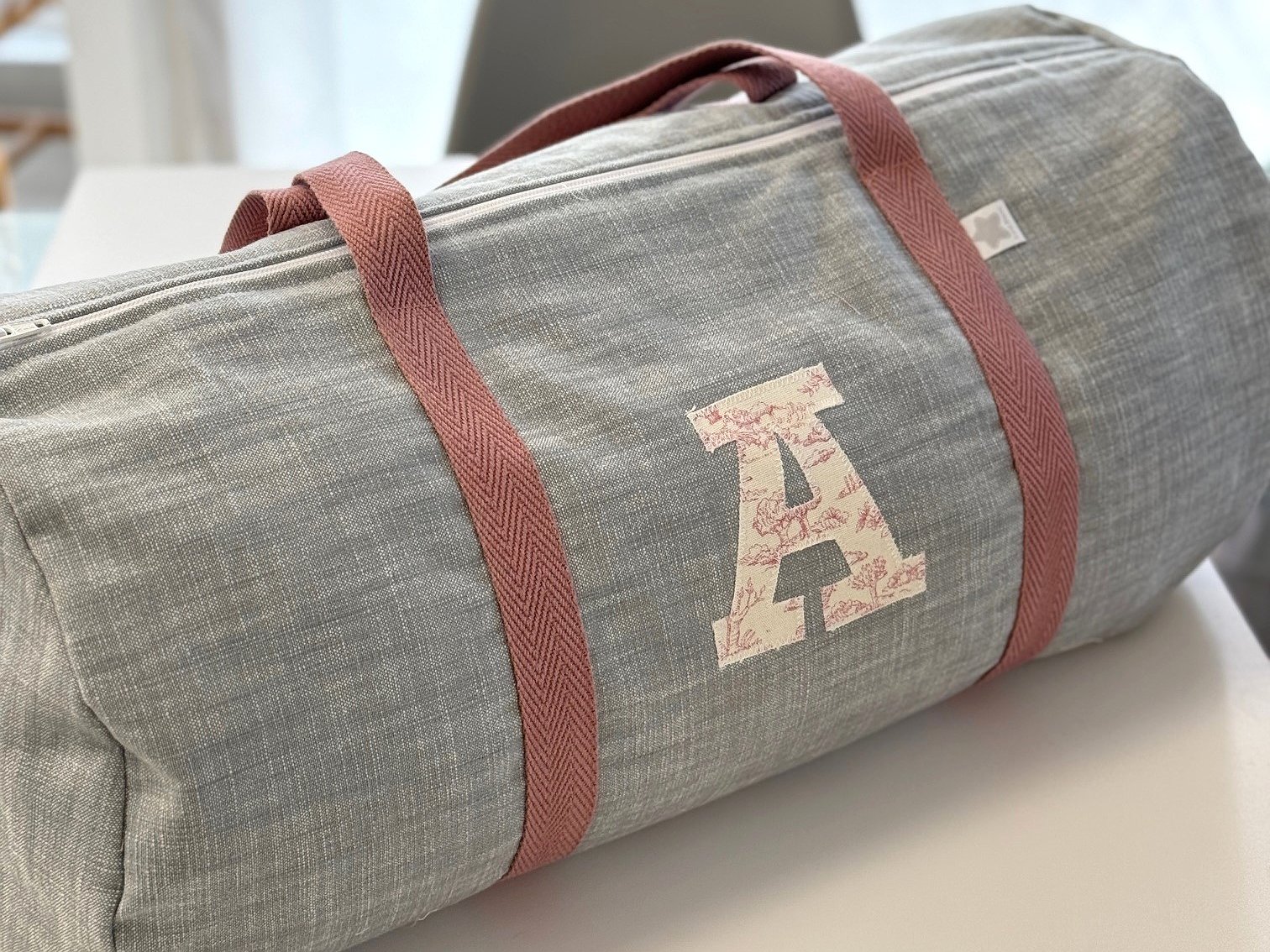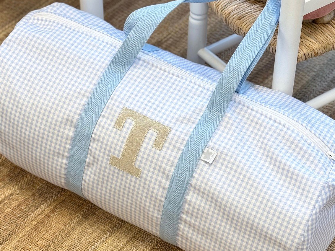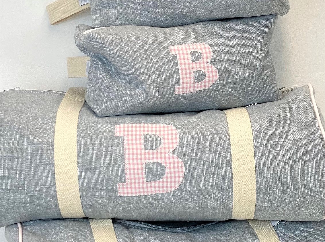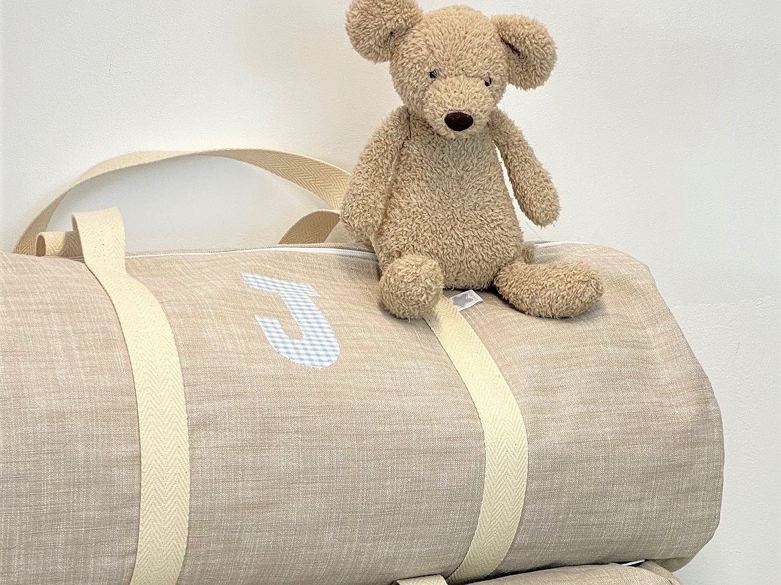 Macuto weekend con inicial o detalle aplicado en la tela que más te guste acolchada y con asas de mano para coger.