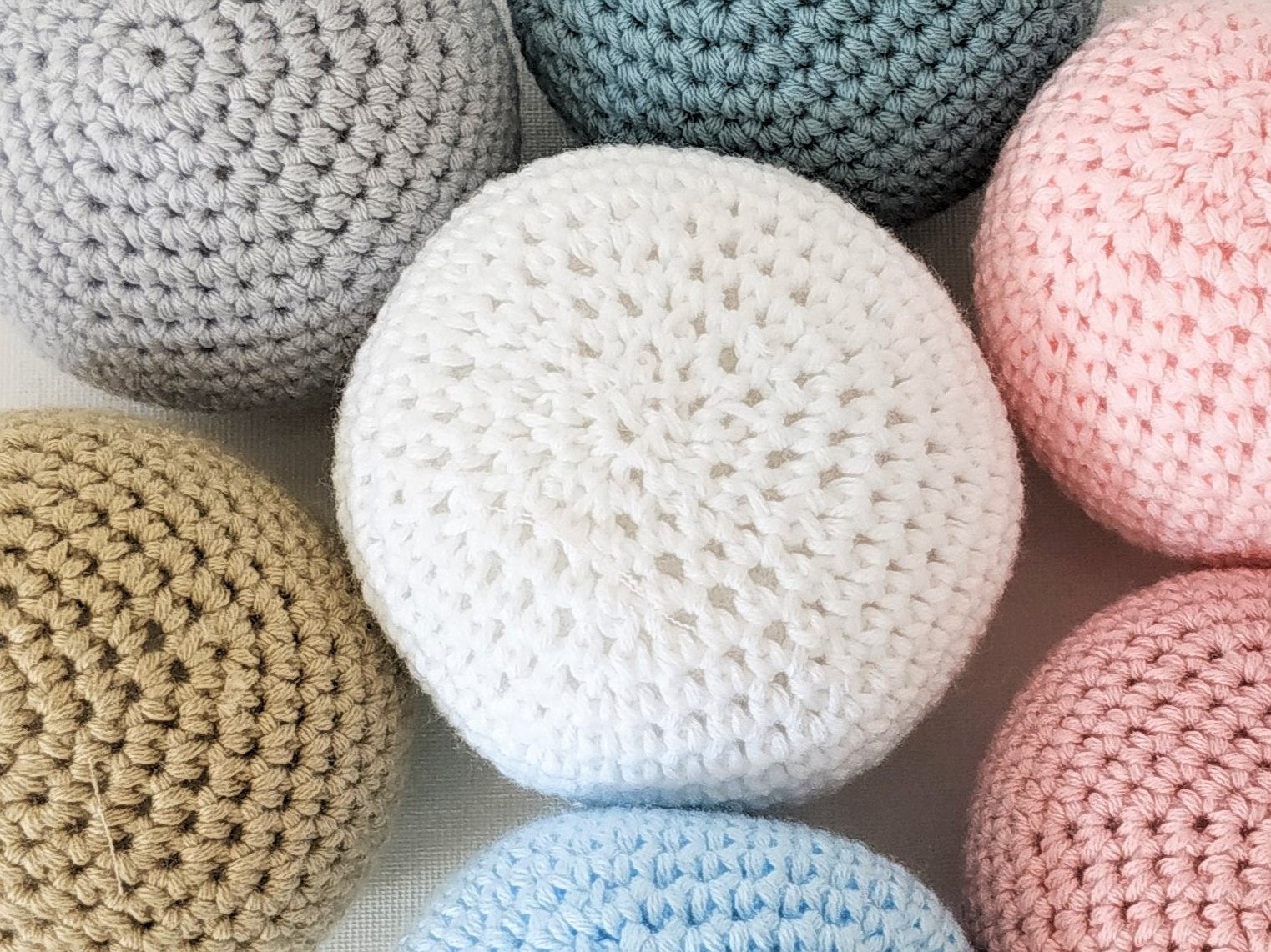 Azul cielo, blanco , rosa bebé, rosa palo, gris y verde.