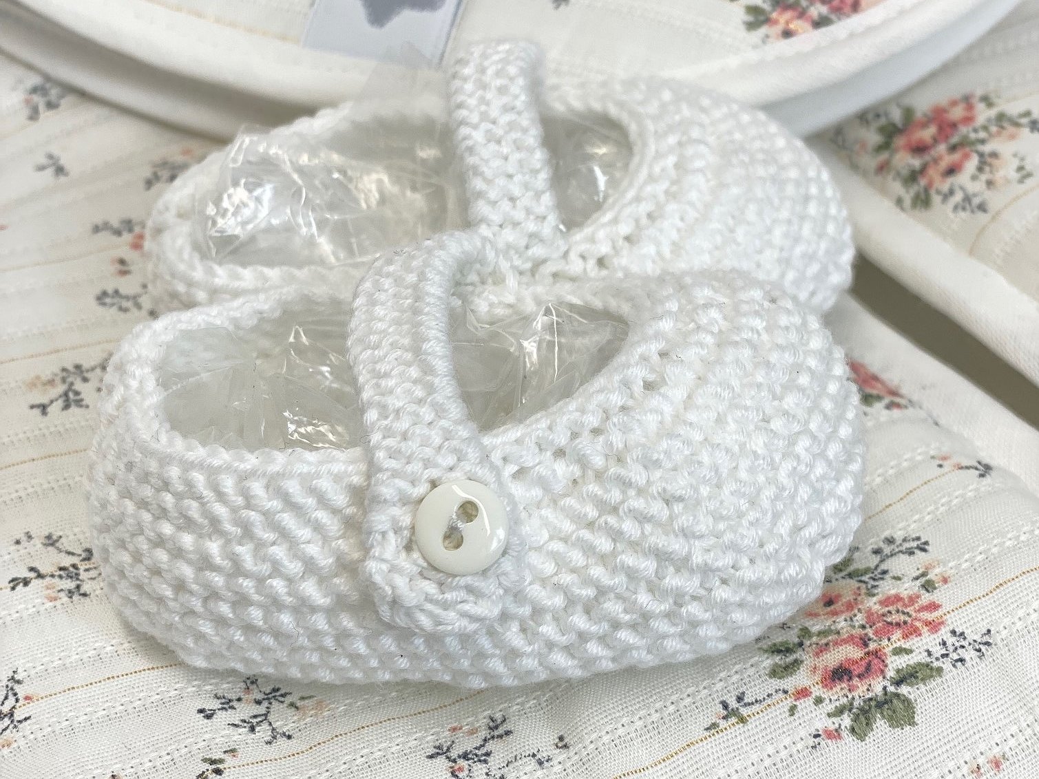 Puedes conjuntar el look con la Capota hecha a mano en punto de algodón y el Cubre pañal hecho a mano en punto de algodón