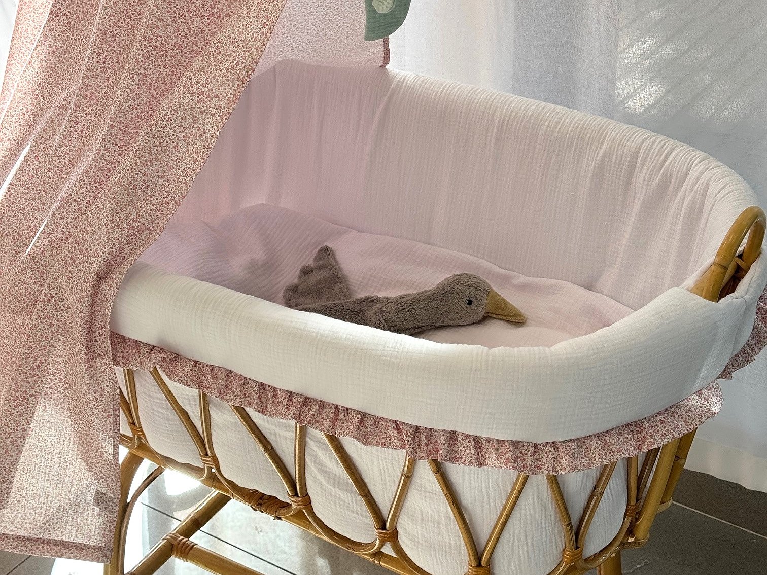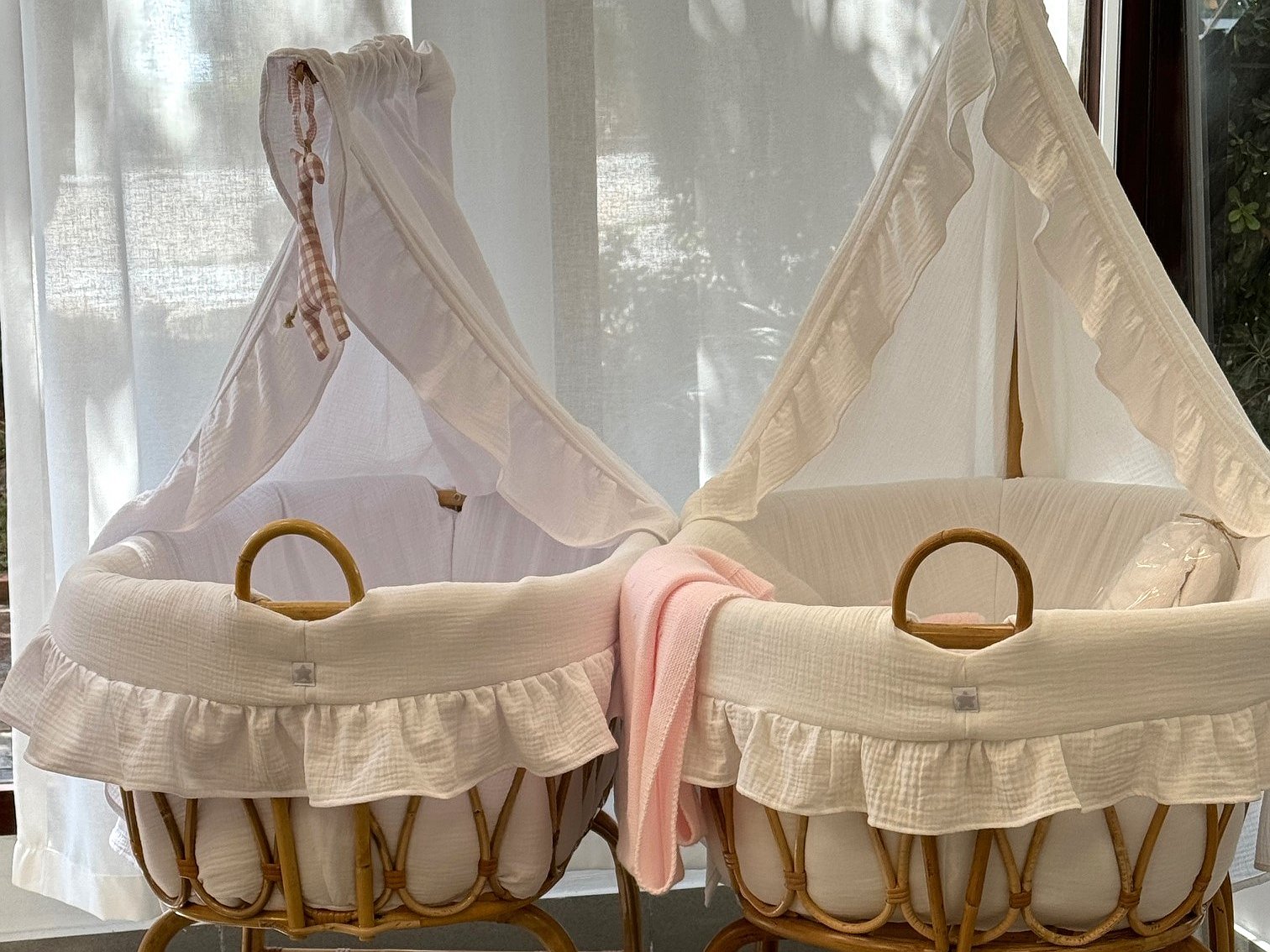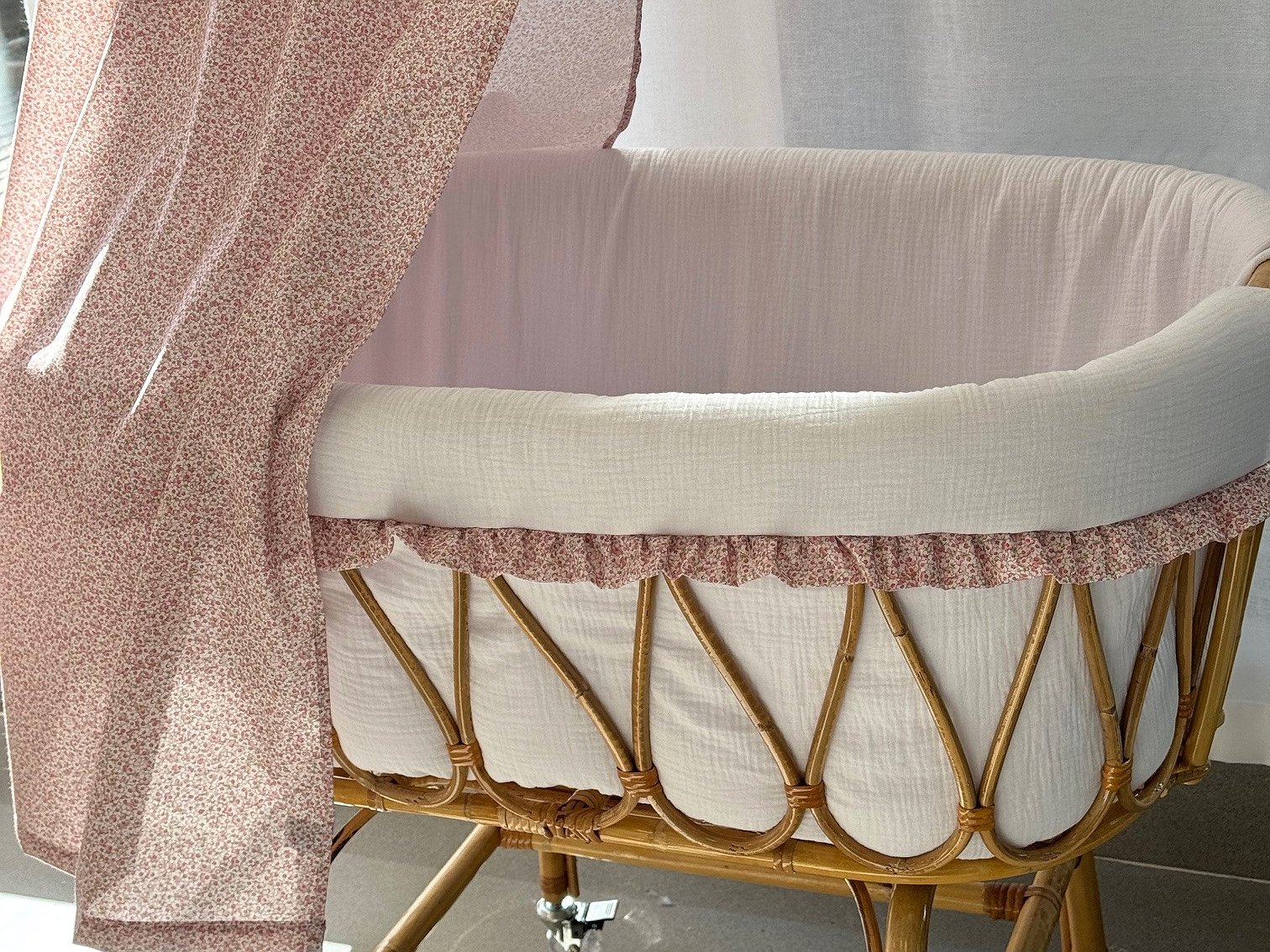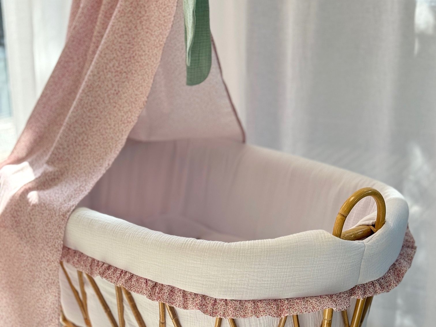 Moisés de caña de bambú ovalado mini con volantes para recién nacido. Imagina un ambiente natural, elegante y delicado con estas mini cunas.