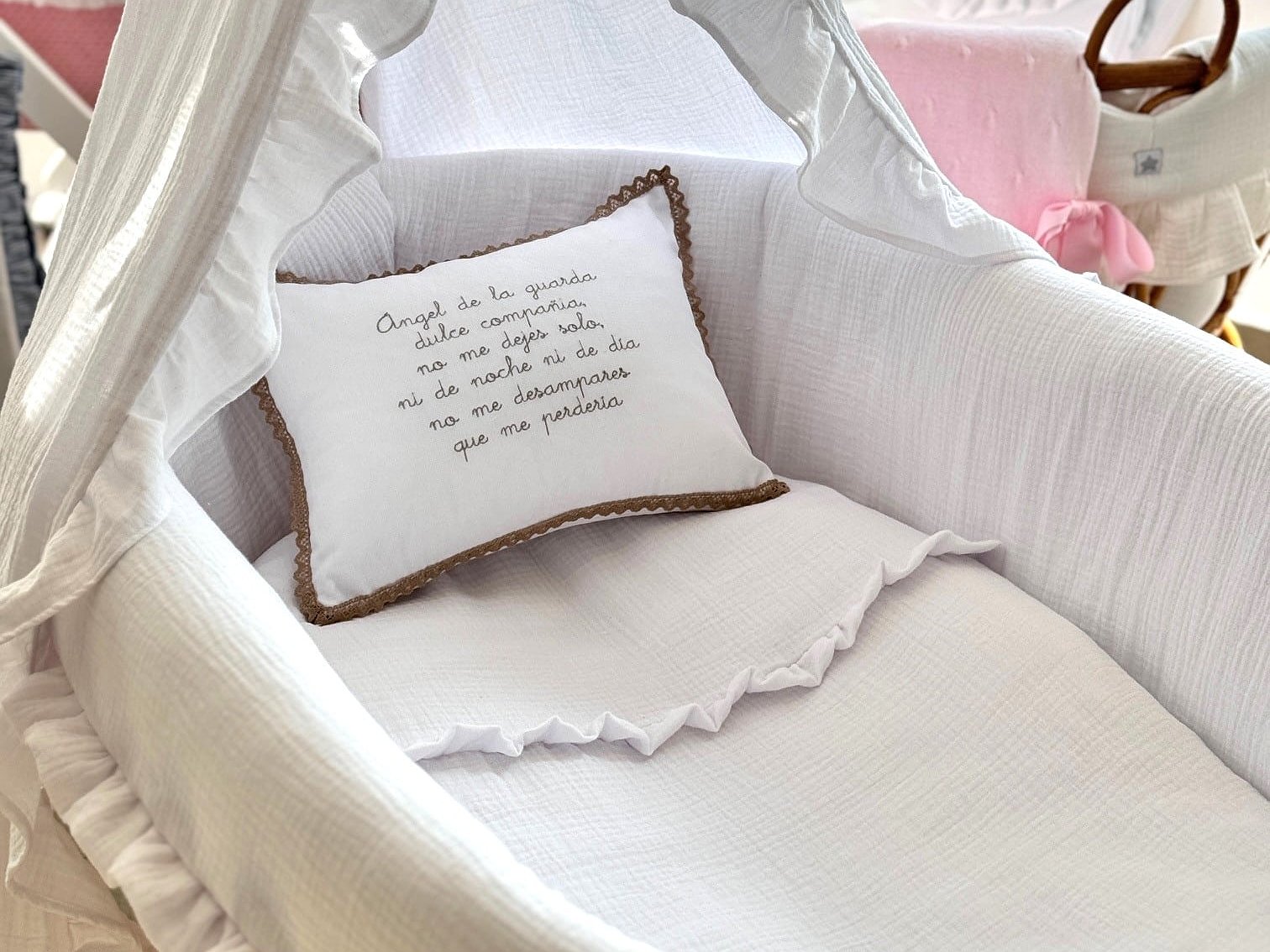 Por orto lado, podrás elegir la tela de los lazos para darle el toque al moisés. Viene incluido el colchón.