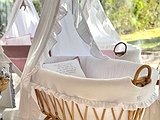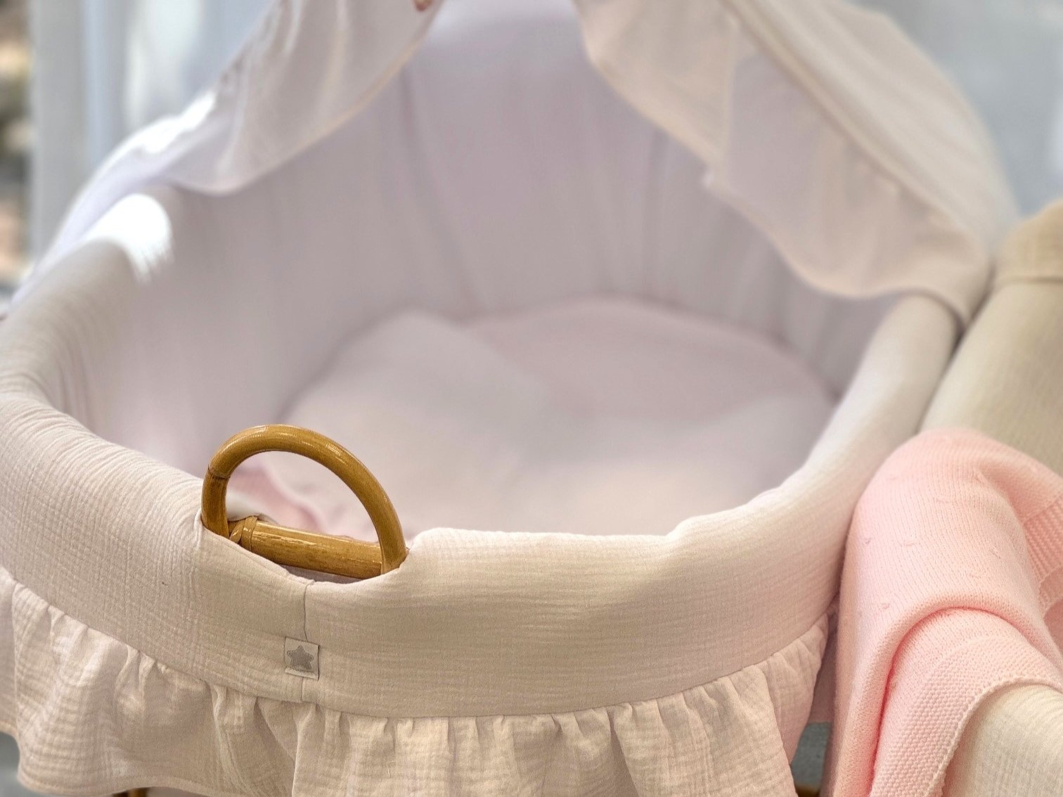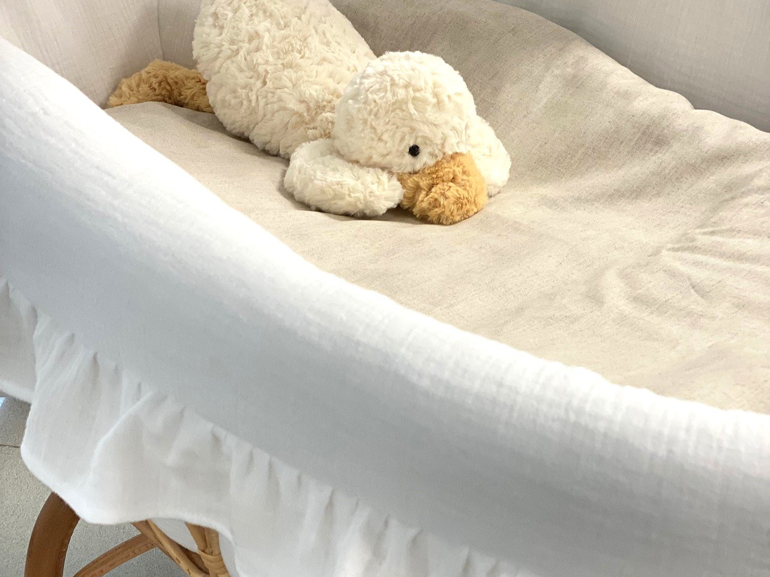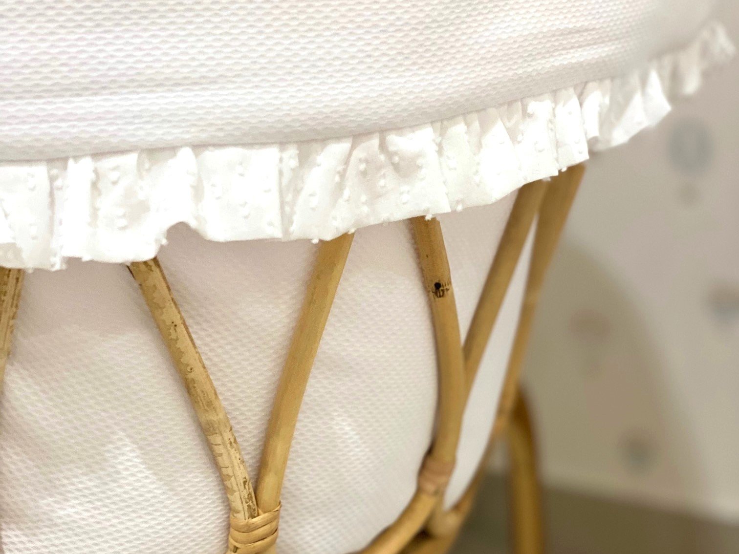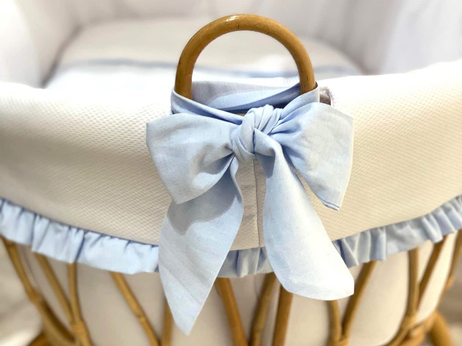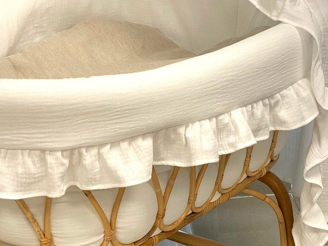 Moisés de caña de bambú ovalado XL con volantespara recién nacido. Imagina un ambiente natural, elegante y delicado con estas mini cunas.