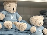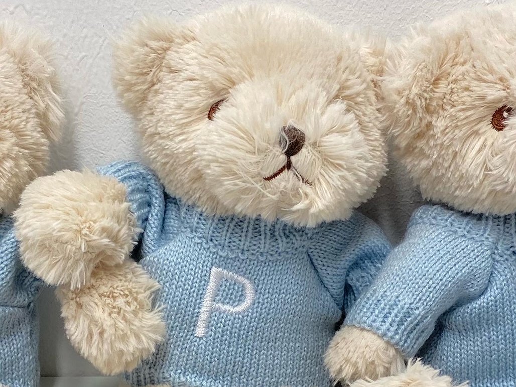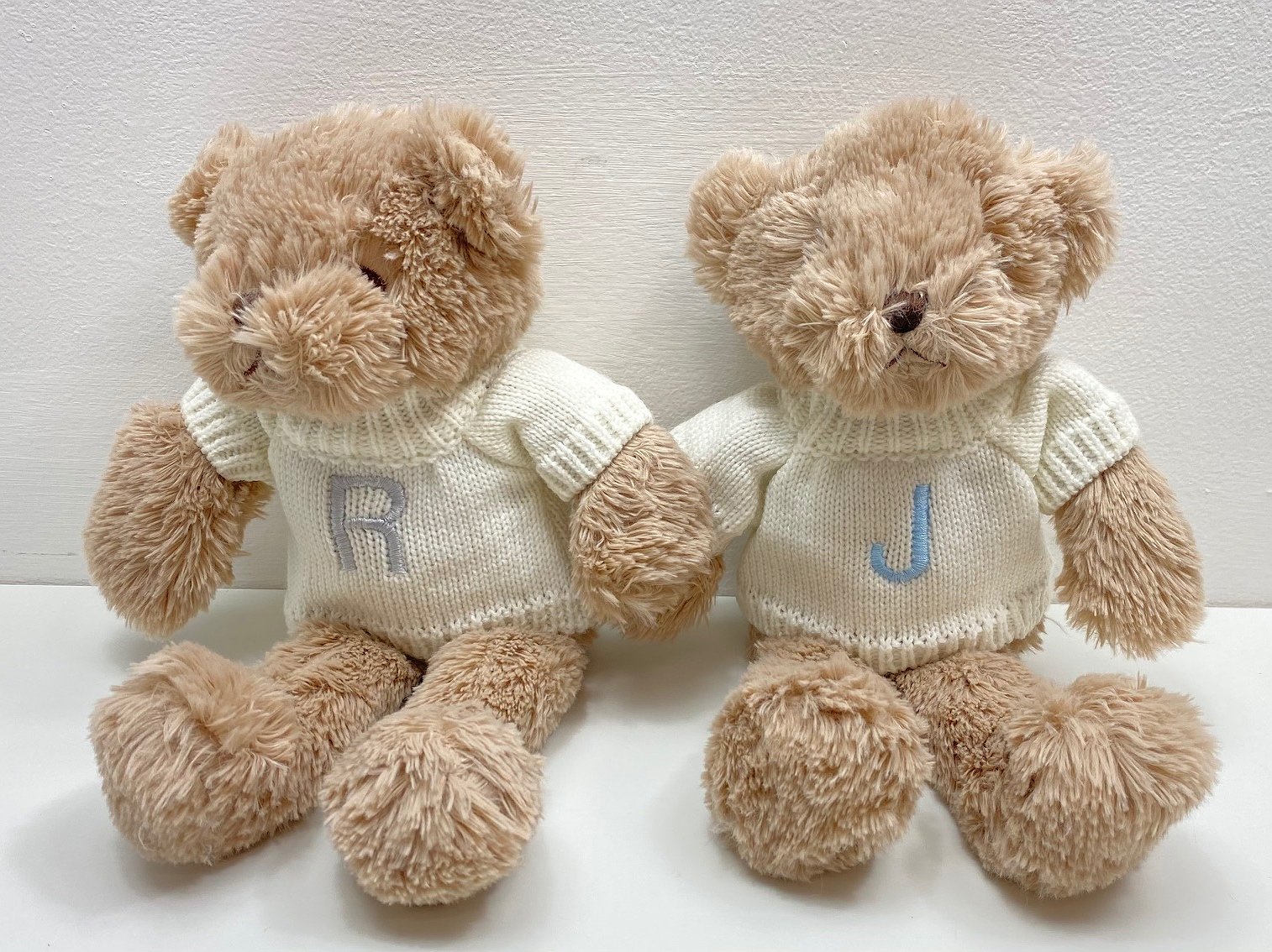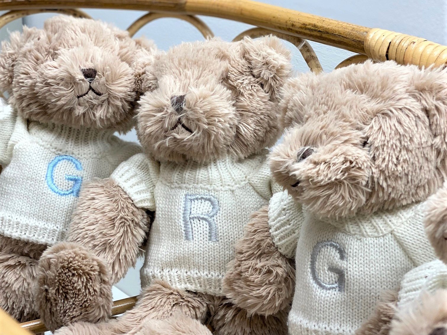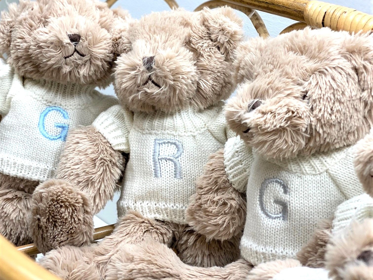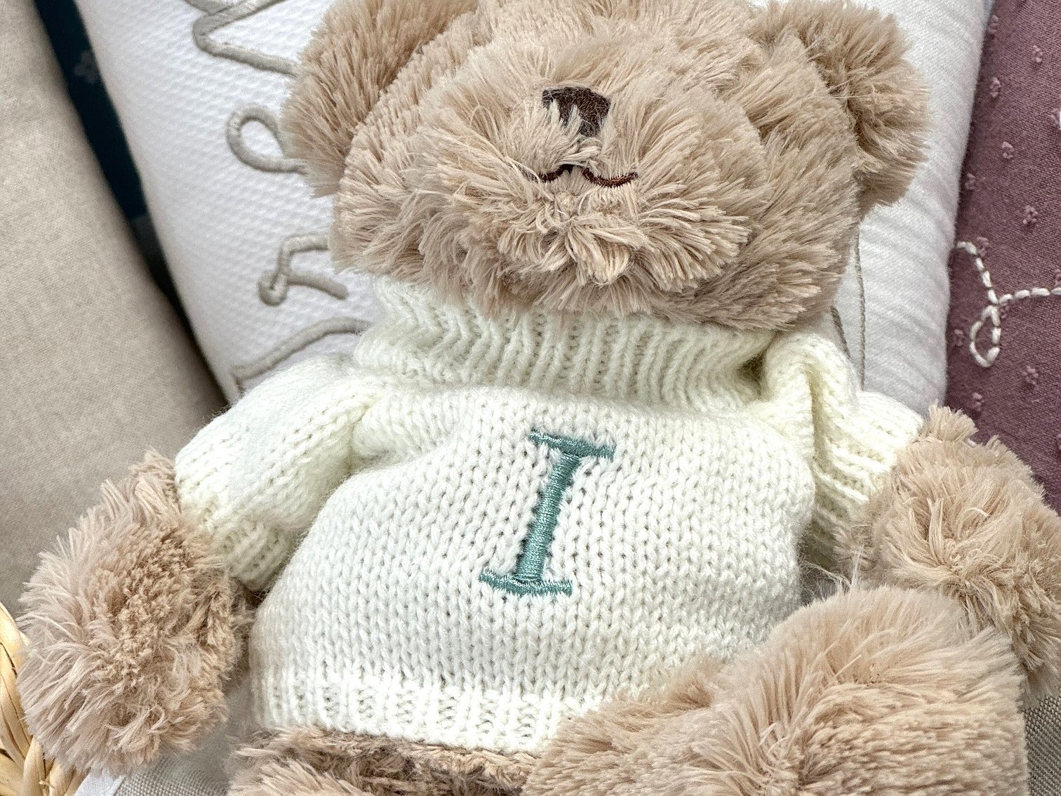 Osito con jersey personalizado con inicial bordada. Se trata de un osito de peluche en color beige o en blanco muy suave.