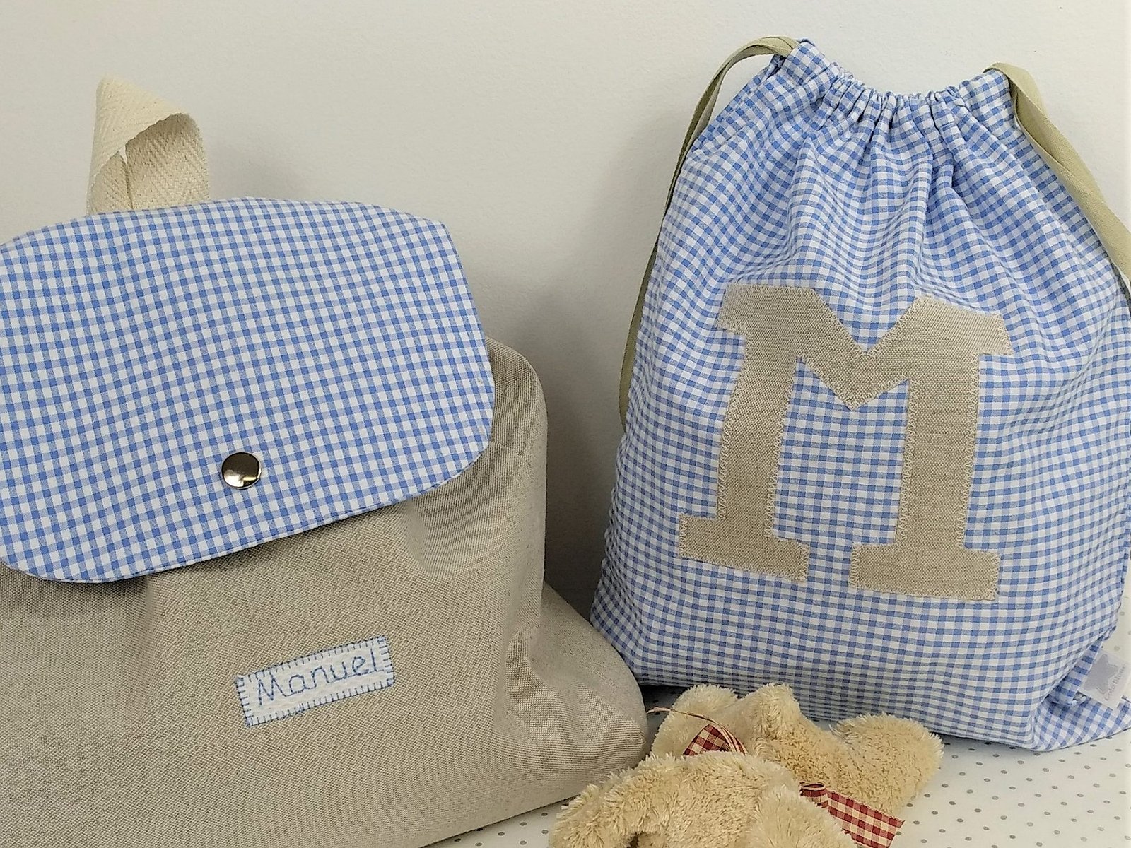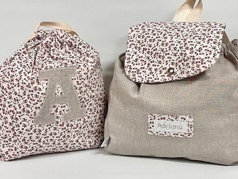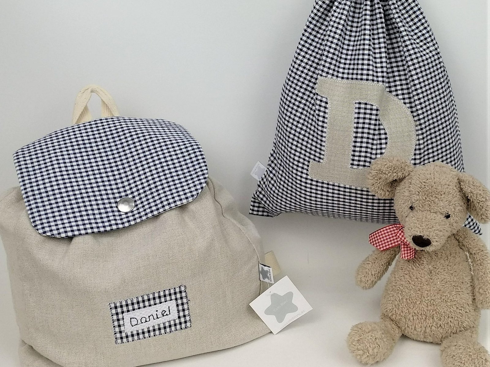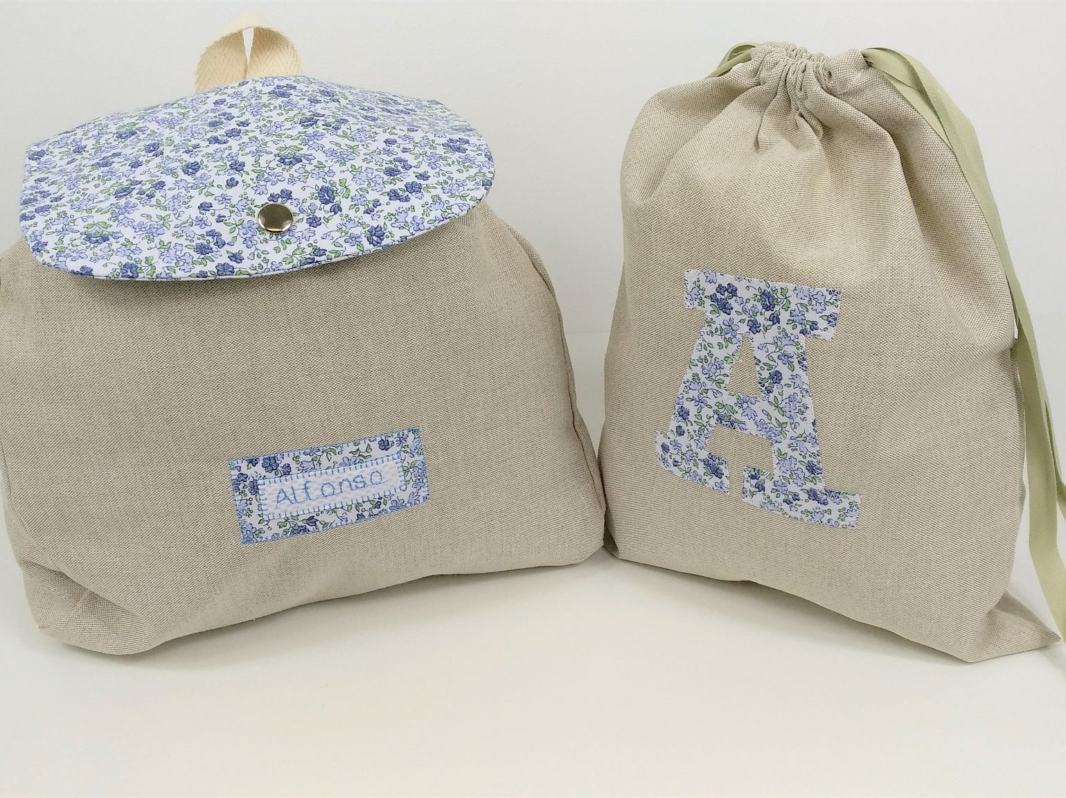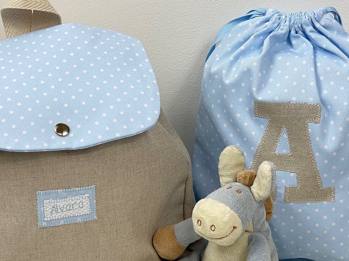 Pack mochila guardería de tela con nombre + bolsa merienda. El conjunto perfecto para la vuelta al cole.