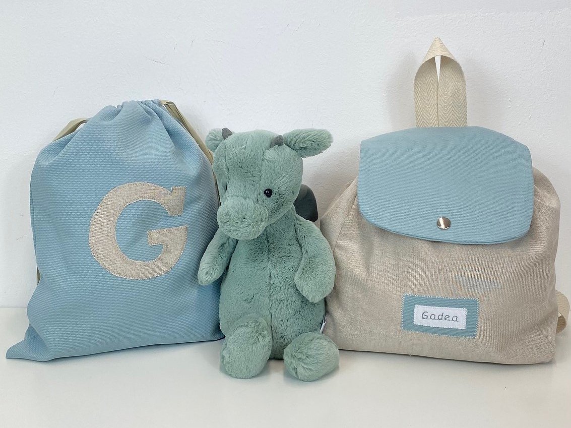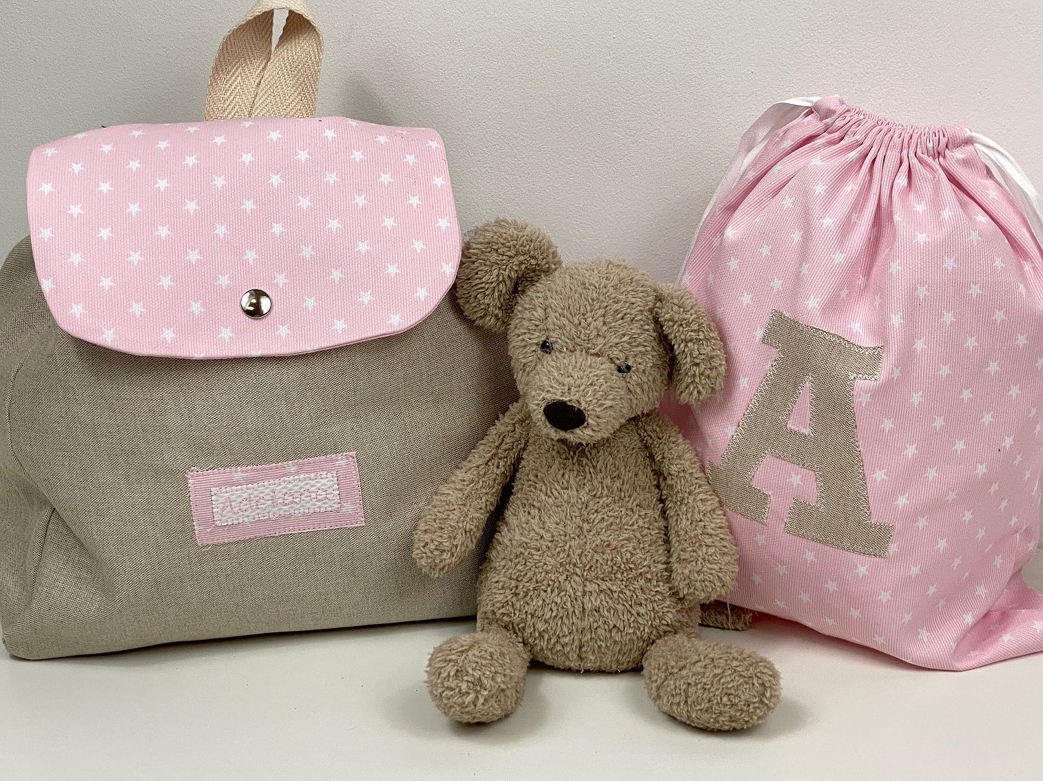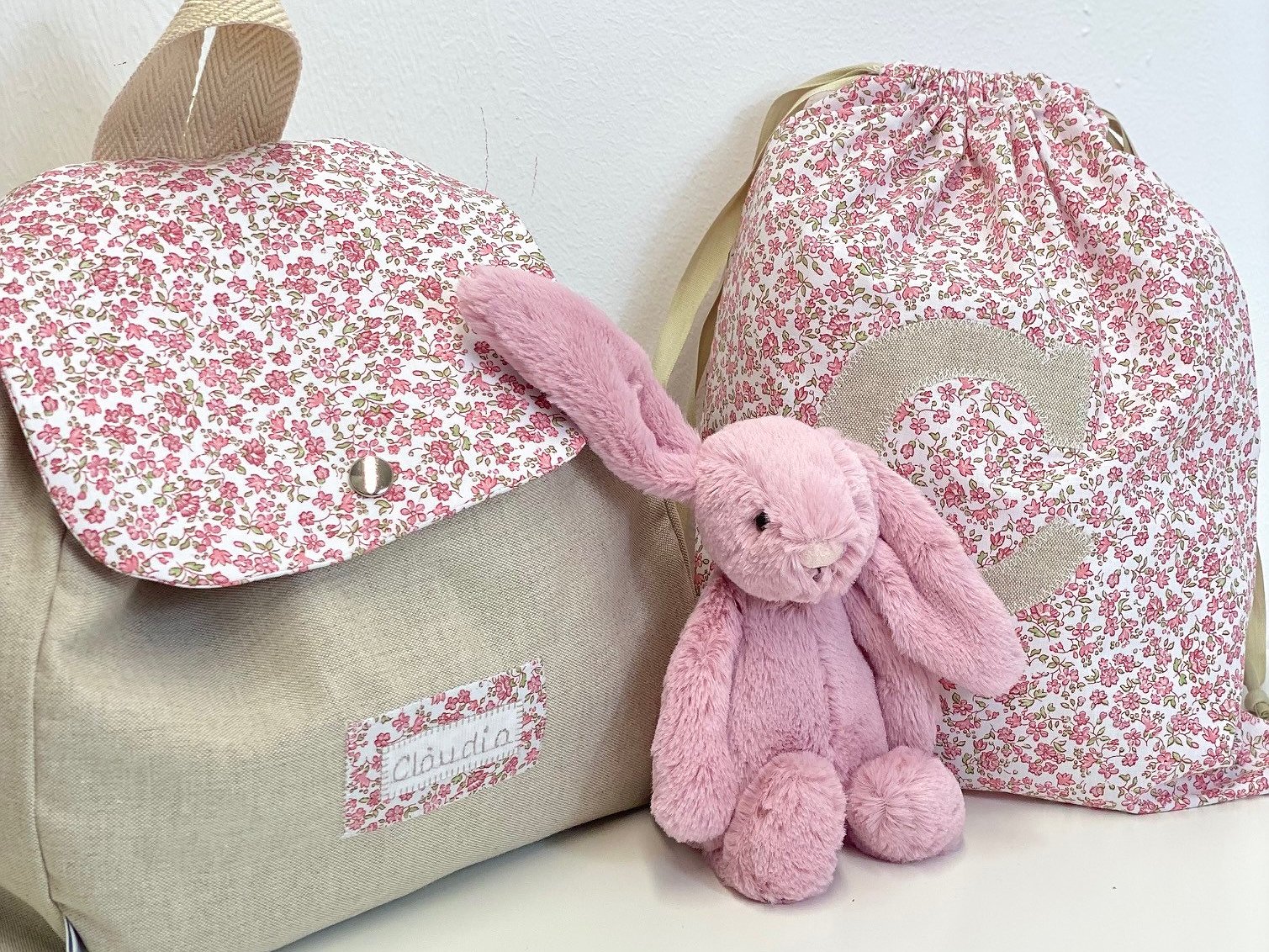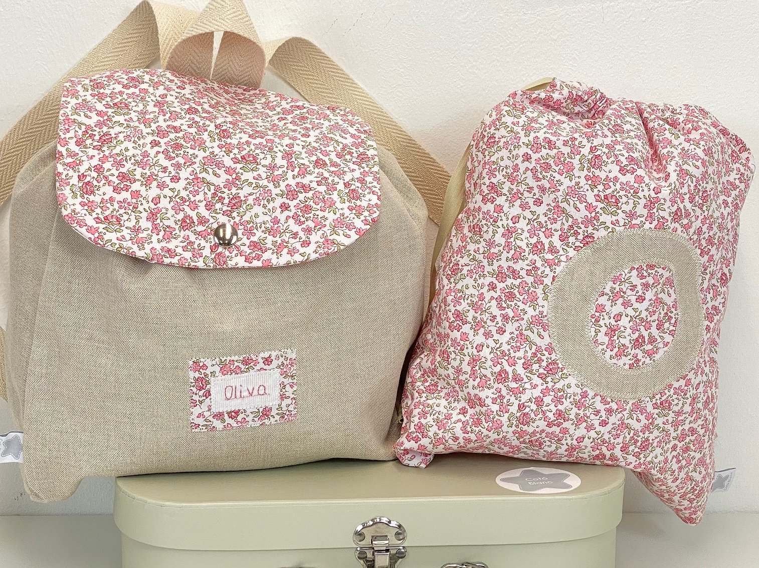 Pack mochila guardería de tela con nombre + bolsa merienda. El conjunto perfecto para la vuelta al cole.
