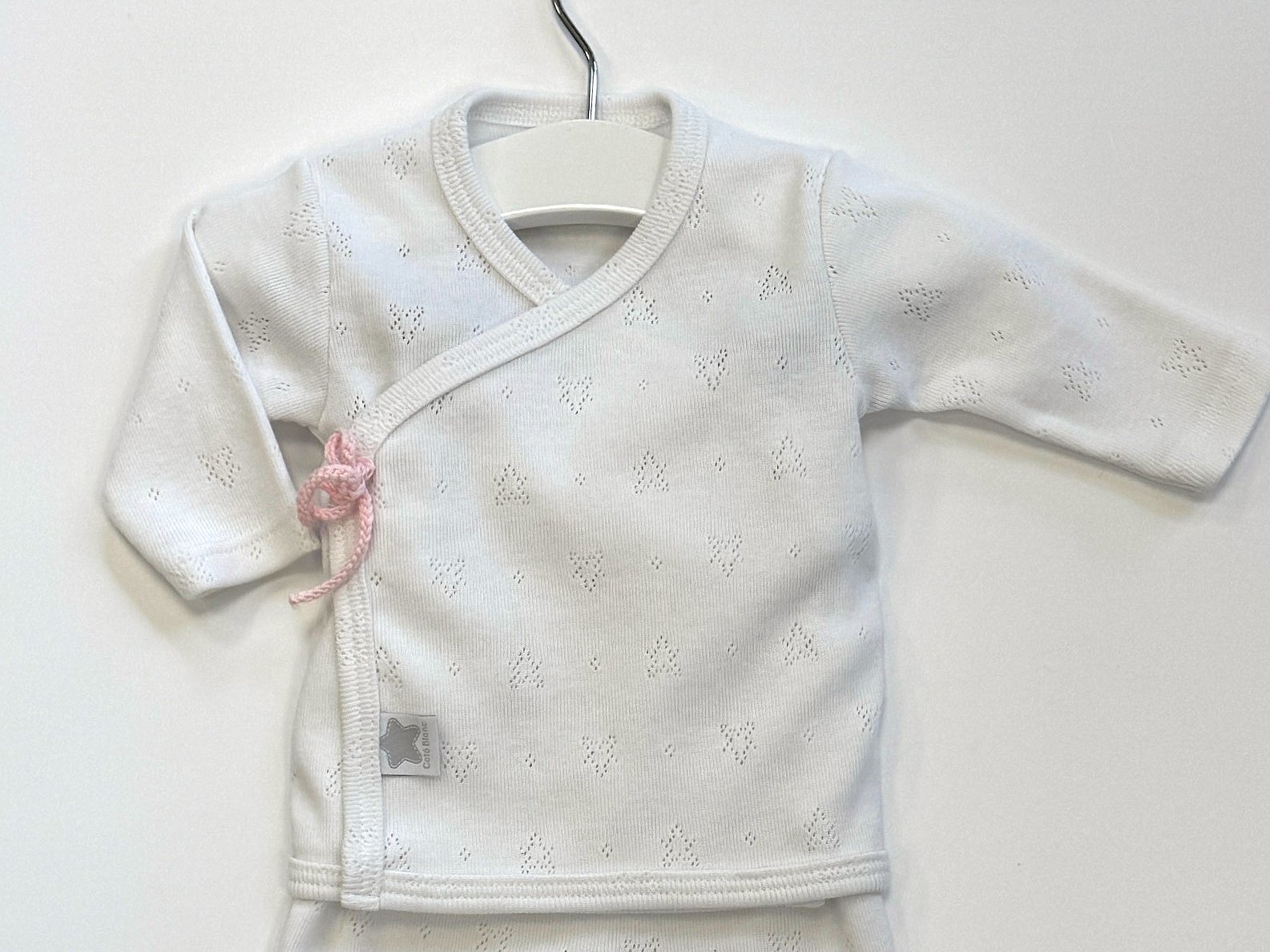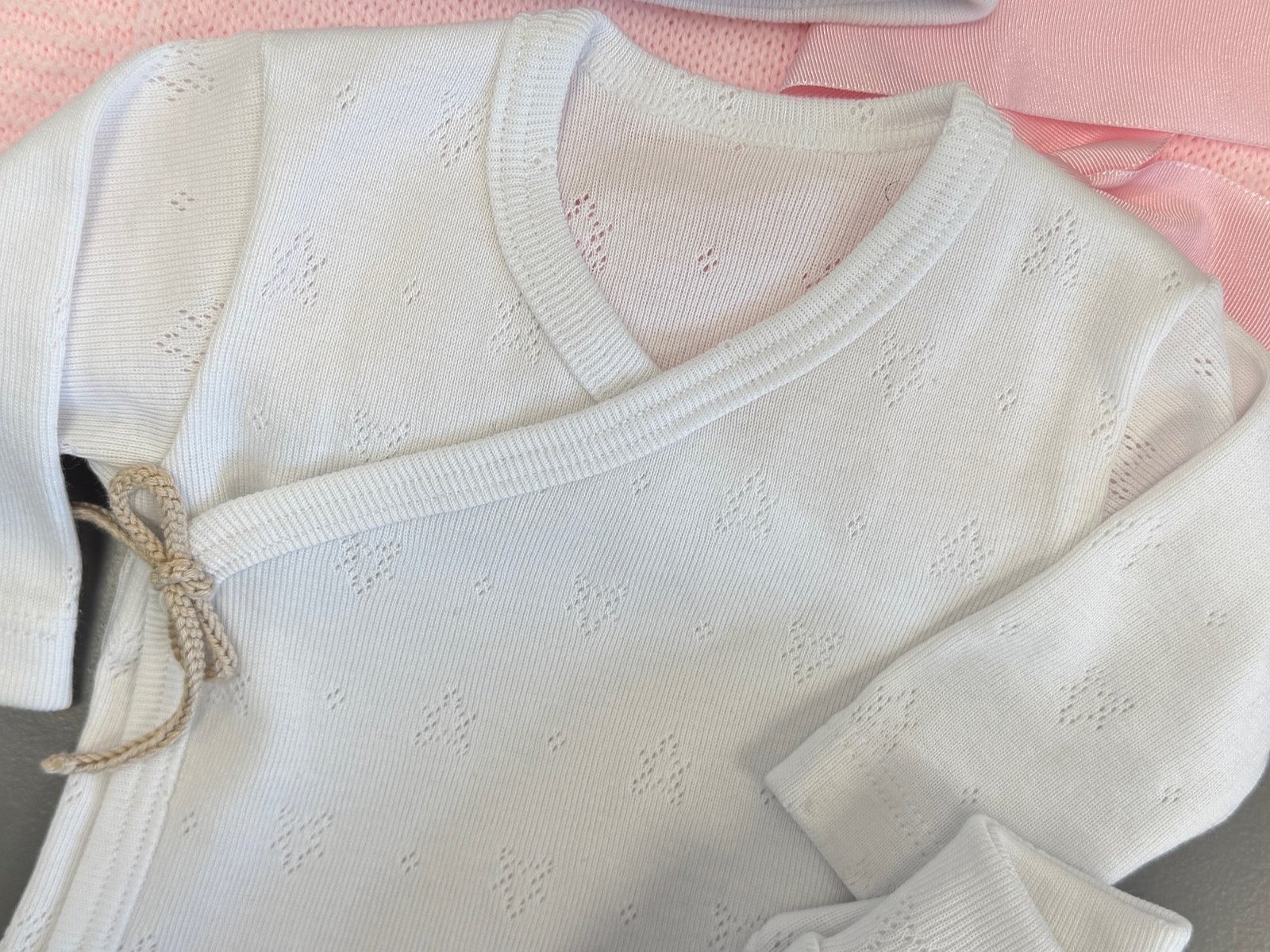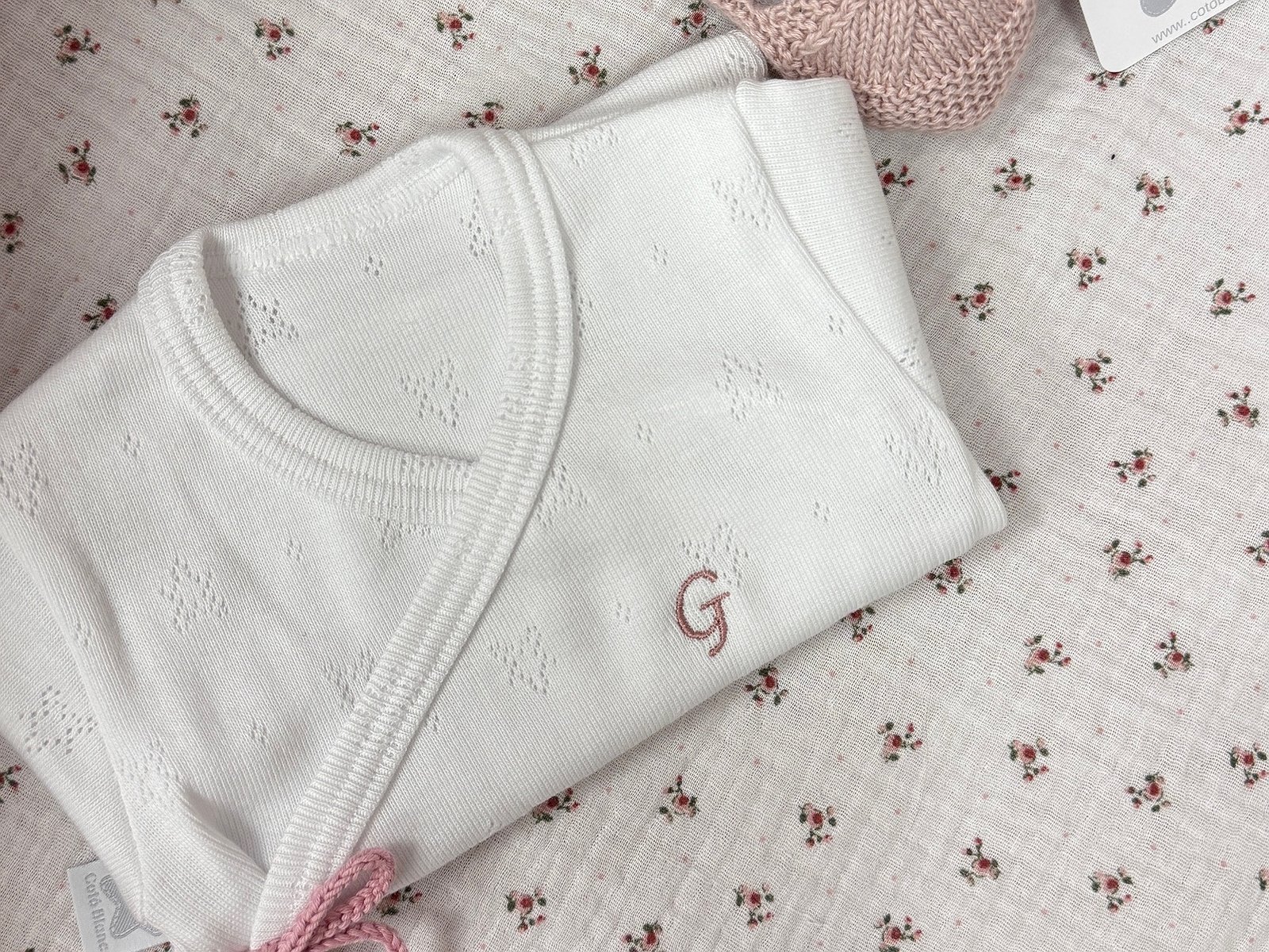 Lleva el detalle del lazo hecho a mano, puedes escoger el color que quieras para conjuntar con el bordado del gorrito o con los arrullos.
