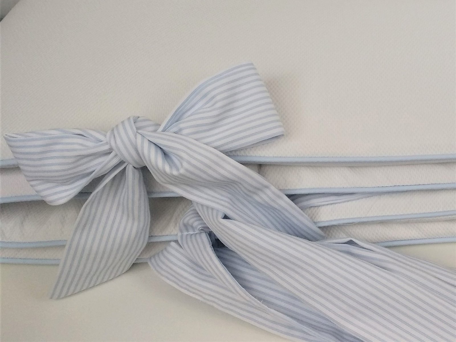 Consideramos que no es muy recomendable hacer el protector de cuna todo COMPLETO, porque el niño no debe sentirse metido en una caja, querrá levantarse porque no ve nada. Si tienes un niño más movido y así lo consideras oportuno tú, puedes pedirnos protector completo. Así elige la medida de la cuna, el color del cordoncillo, una tela para los protectores de entre todas las que te proponemos y otra para los lazos .